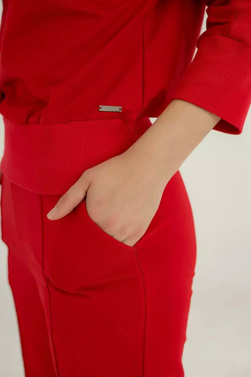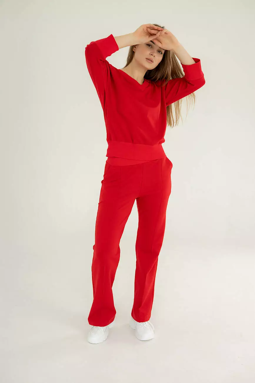 вирізом і прямі штани Стильний жіночий костюм із двонитки — це
