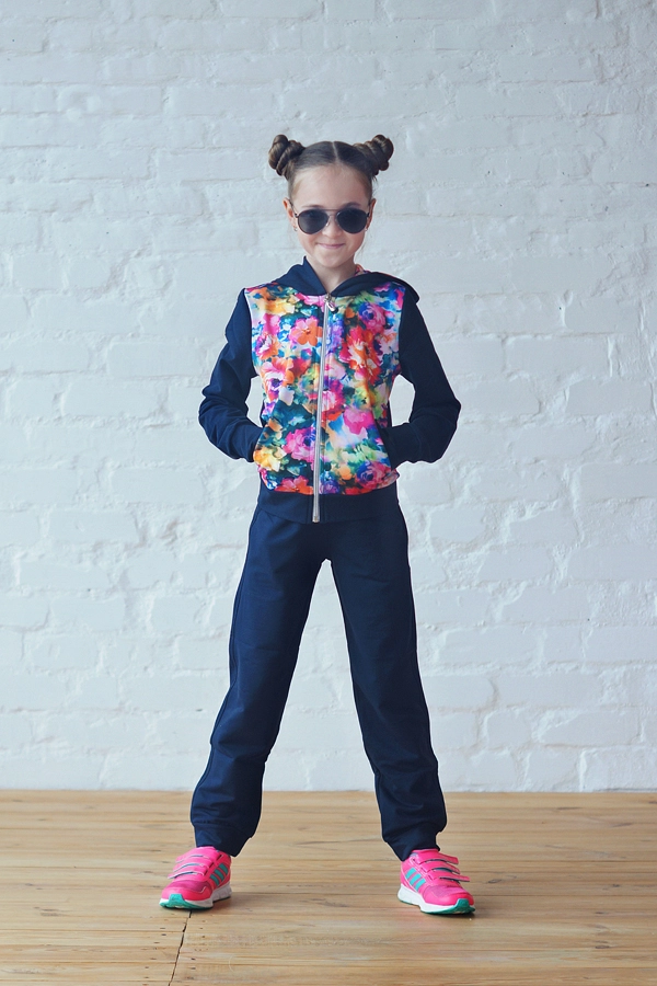 Спортивный подростковый костюм для девочек с капюшоном.Тёмно синий цвет костюма с вставками на груди и в капюшоне из дайвинга с цветным принтом.Этот костюм прекрасно подойдёт девочкам подросткам возрастом с 7 до 11 лет. Данную модель можно использовать как в повседневной жизни так и для активного занятия спортом на природе или в закрытом помещении.