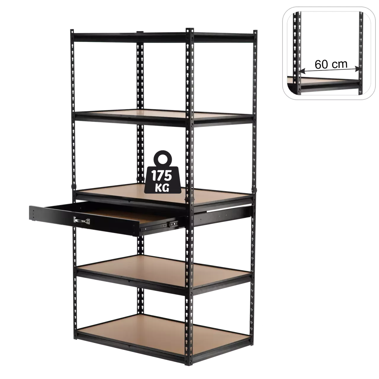 Міцна конструкція зі сталі з оцинкованим покриттям забезпечує високу стабільність і стійкість до корозії, що гарантує довгий термін служби стелажа. Регульовані полиці з МДФ дозволяють легко налаштувати висоту під різні предмети, а практична шухляда забезпечує зручне зберігання дрібних інструментів та аксесуарів.