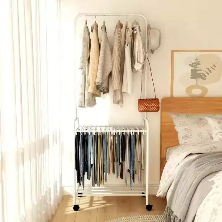 Этот стеллаж-вешалка предназначен для удобного хранения одежды,