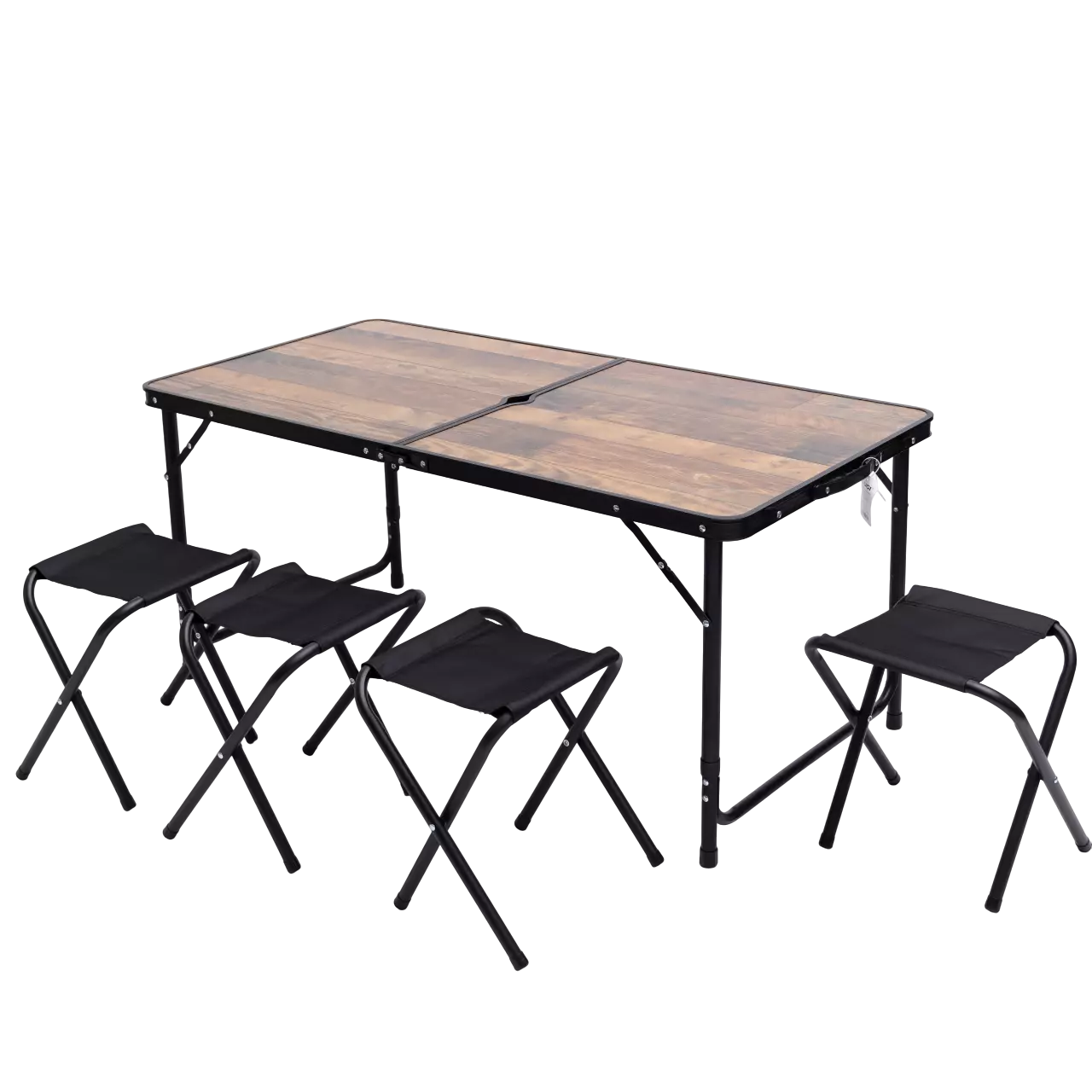 • Система «кейс»: Стіл складається навпіл, перетворюючись на компактну валізу з ручкою. Всі чотири стільця забираються всередину столу, що дозволяє переносити весь комплект однією рукою і акуратно зберігати його в багажнику.