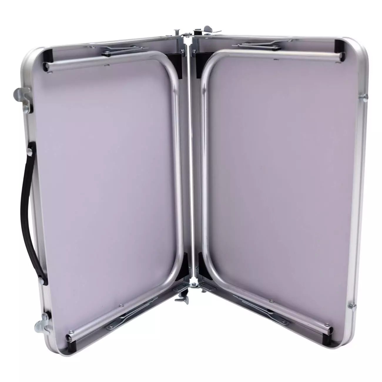 Стільниця виготовлена з ламінованого МДФ, стійкого до вологи та простого в догляді. Конструкція складається з двох половин, з’єднаних шарніром посередині, що дозволяє швидко розгортати та складати стіл без додаткових інструментів. Алюмінієвий каркас забезпечує легкість конструкції, водночас зберігаючи її стійкість. Ніжки мають фіксатори та пластикові накладки для додаткової безпеки та захисту поверхні.