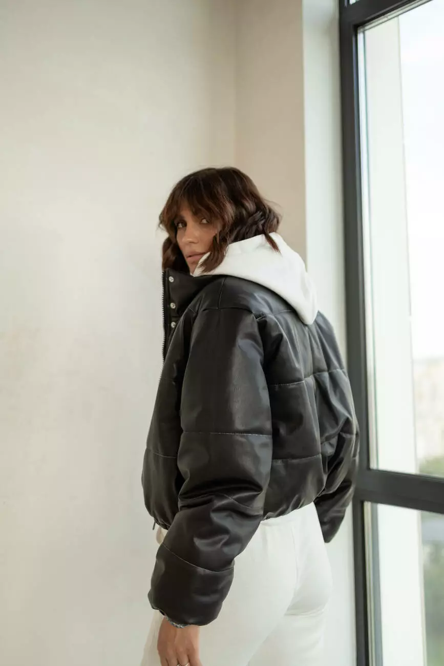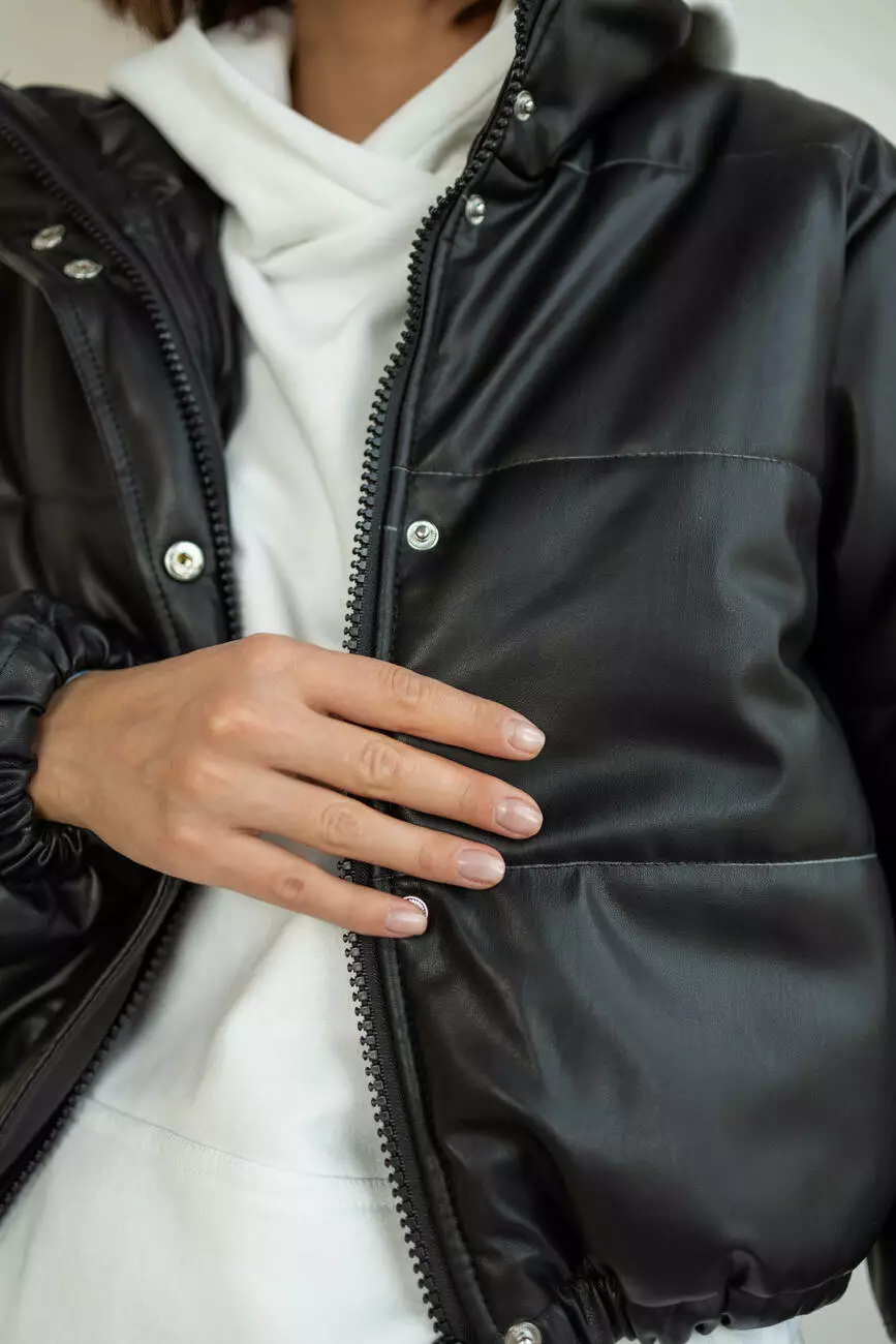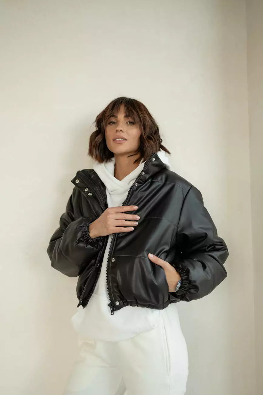 Укорочений пуховик із штучним утеплювачем виконаний із екошкіри якості lux. Коротка довжина, гумка по низу виробу та на манжетах, комір-стійка та трендовий колір роблять модель актуальною цього сезону. Куртка відмінно захищає від вітру, холоду та вологи, підходить на холодну осінь та теплу зиму.