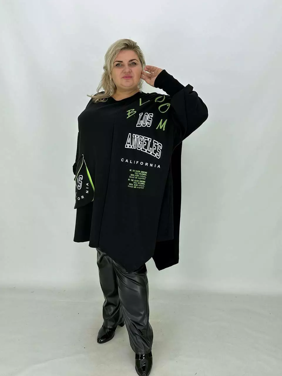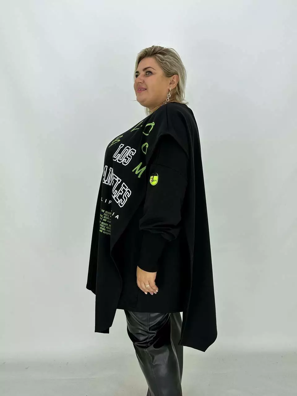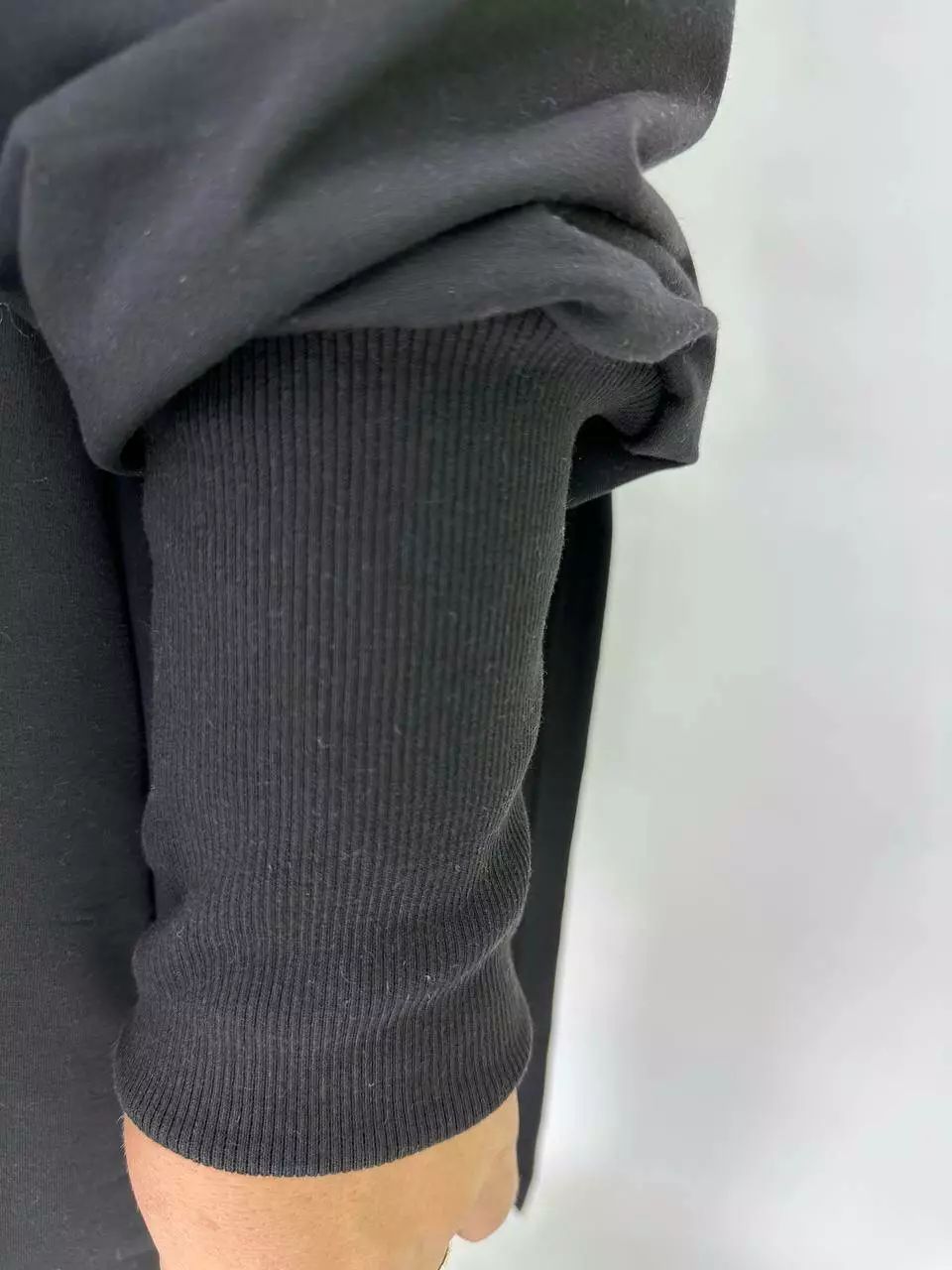 Вільний силует зі спущеним плечем, високий манжет з рибани.