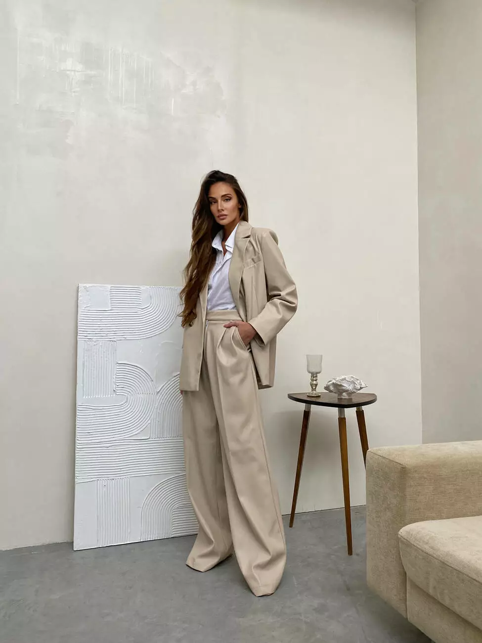 Стильний класичний костюм ALEX з екошкіри в стилі оверсайз колір світлий беж