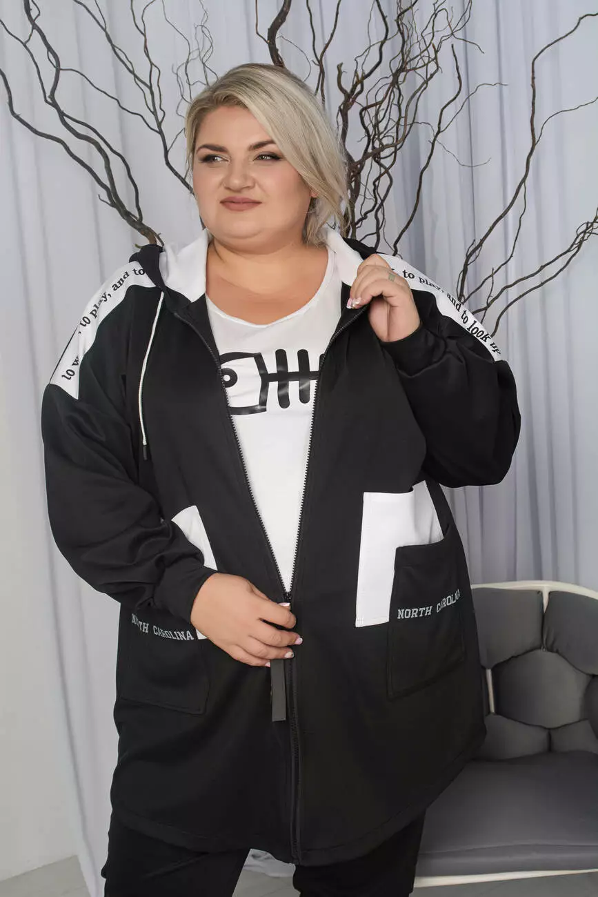 Стильний костюм з дайвінгу дуже гарної якості, гарна розтяжність, приємна до тіла, не линяє та не кашлатиться. Кофта вільного крою зі спущеним плечем застібається на змійку. Штани з високою посадкою, з кишенями, пояс на резинці. Костюм прикрашений якісними накатками.