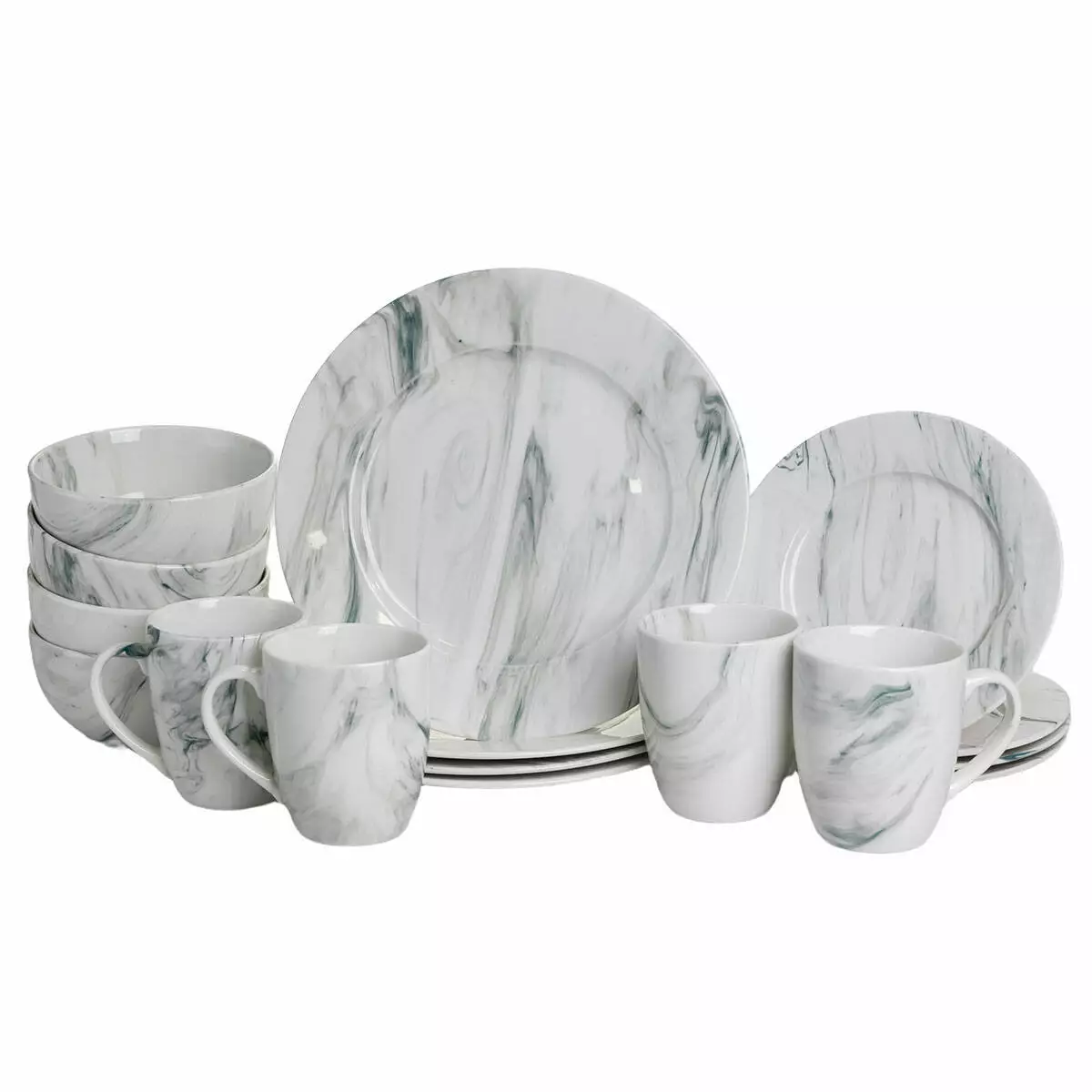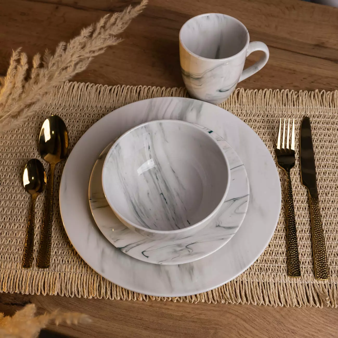 Столовий сервіз із порцеляни Marmor 16 предметів на 4 персони — практичне рішення для повсякденного користування та сервірування святкового столу. Виготовлений із якісної порцеляни, він вирізняється гладкою поверхнею, стійкою до подряпин і перепадів температур. Мармуровий візерунок додає сучасного вигляду, поєднуючи естетику й функціональність.