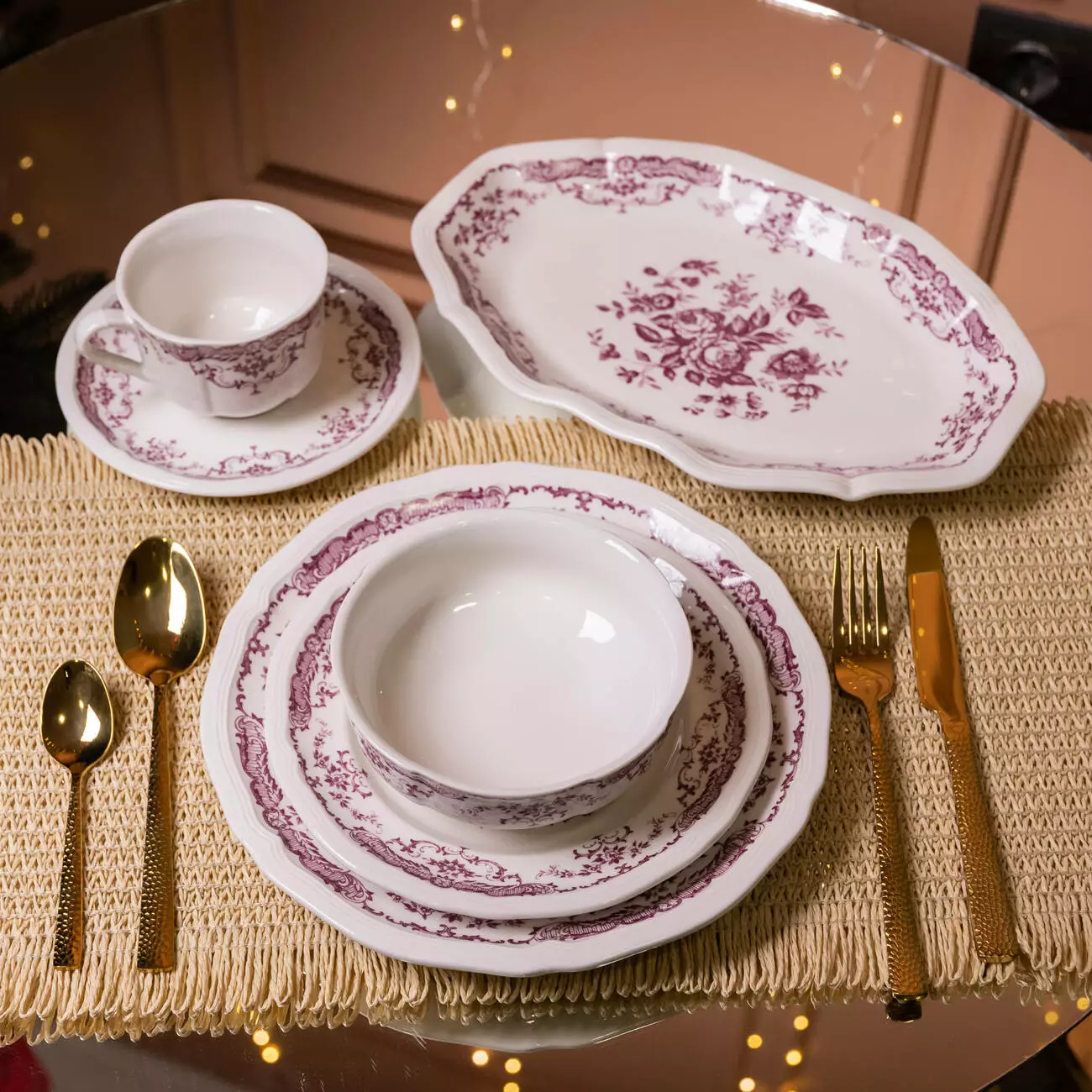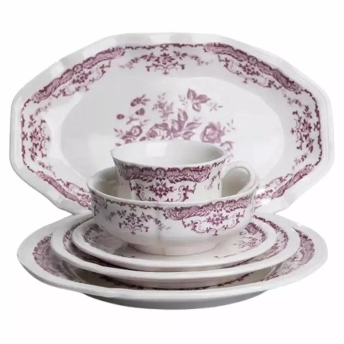 Порцеляновий столовий сервіз Bitossi розрахований на 6 персони та складається з 2 предметів. Кожен елемент виготовлений із високоякісної порцеляни з глянцевим покриттям, що легко миється та зберігає свій вигляд навіть після частого використання. Витончений орнамент у бордових відтінках із флористичним малюнком додає класичного стилю, роблячи набір доречним як для сімейних обідів, так і для сервірування святкового столу.