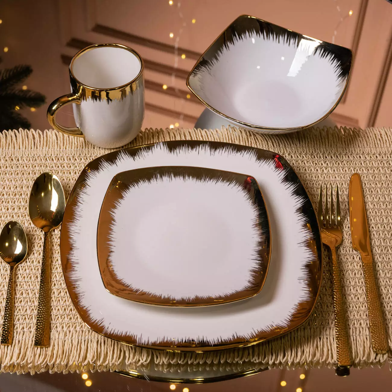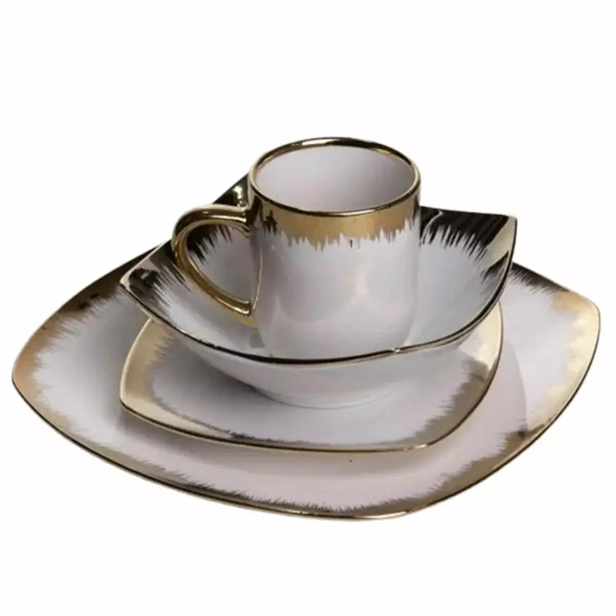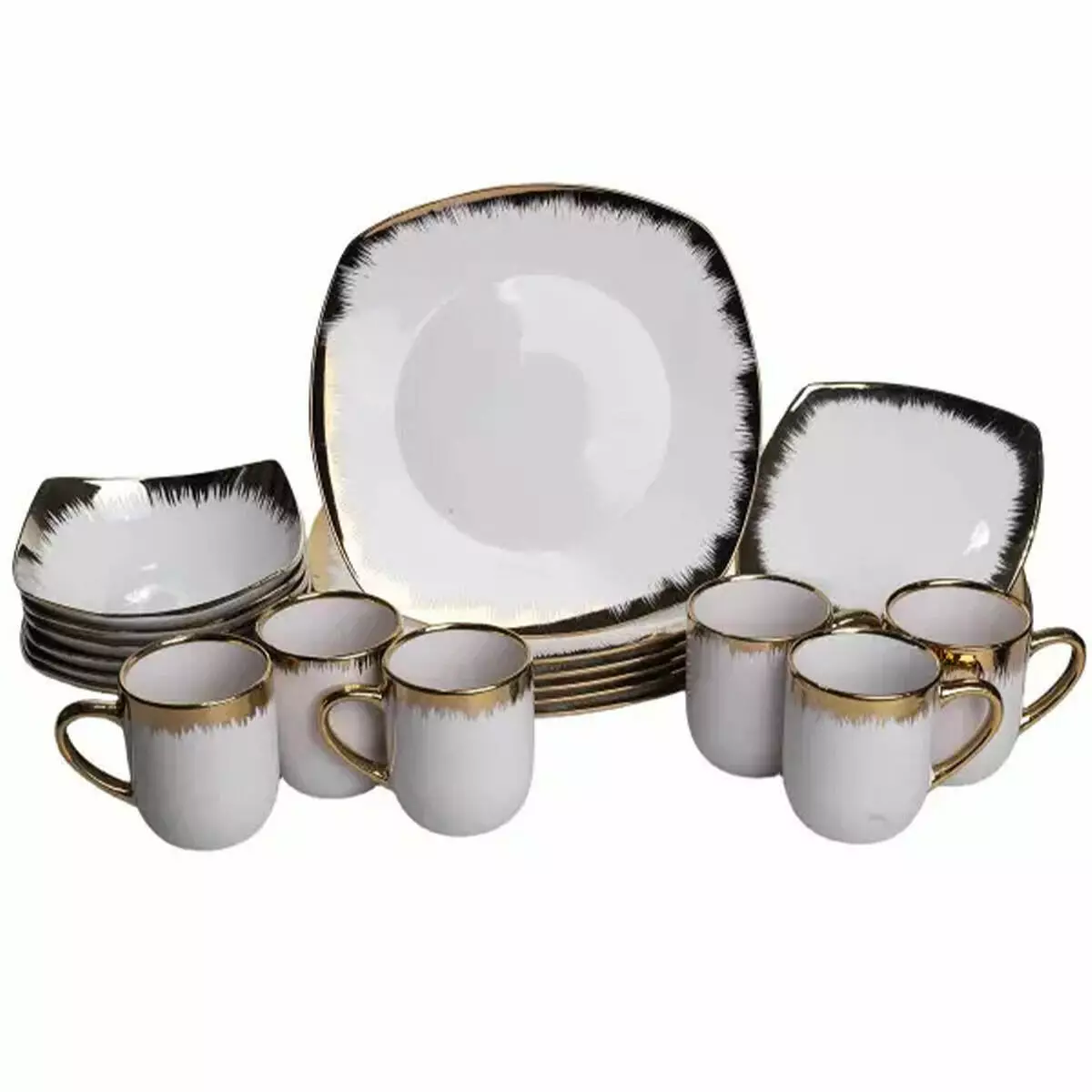 Порцеляновий столовий сервіз Luxury Golden на 6 персон поєднує сучасну геометричну форму та акцентований декоративний кант. У комплект входять квадратні тарілки різних розмірів, глибокі миски та чашки. Порцеляна забезпечує гладку поверхню та приємне тактильне відчуття під час використання.