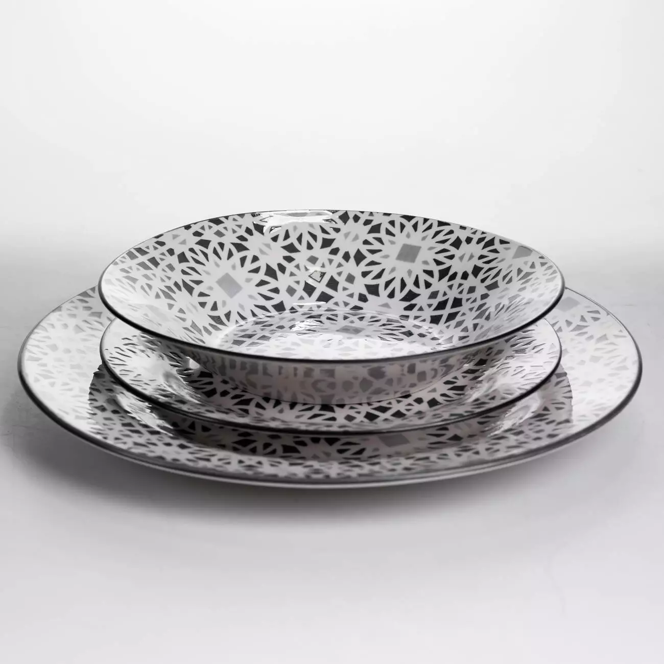 Тарілки мають рельєфний абстрактний орнамент, який створює виразну текстуру на поверхні посуду та додає сервіруванню візуальної глибини. Порцеляна добре зберігає температуру страв і має гладку поверхню, що спрощує очищення після використання та підходить для регулярного застосування.