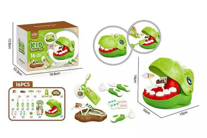 Головна > Каталог > Іграшки > Розвиваючі іграшки > Набір стоматолога 623-922 (72/2) 16 елементів, голова динозавра, отвори в зубах, інструменти, паста, щітка, щипці, солодощі на паличках, в коробці оптом
