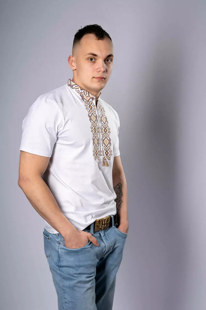 Сучасна чоловіча вишита футболка "Гетьман" біла з коричневим