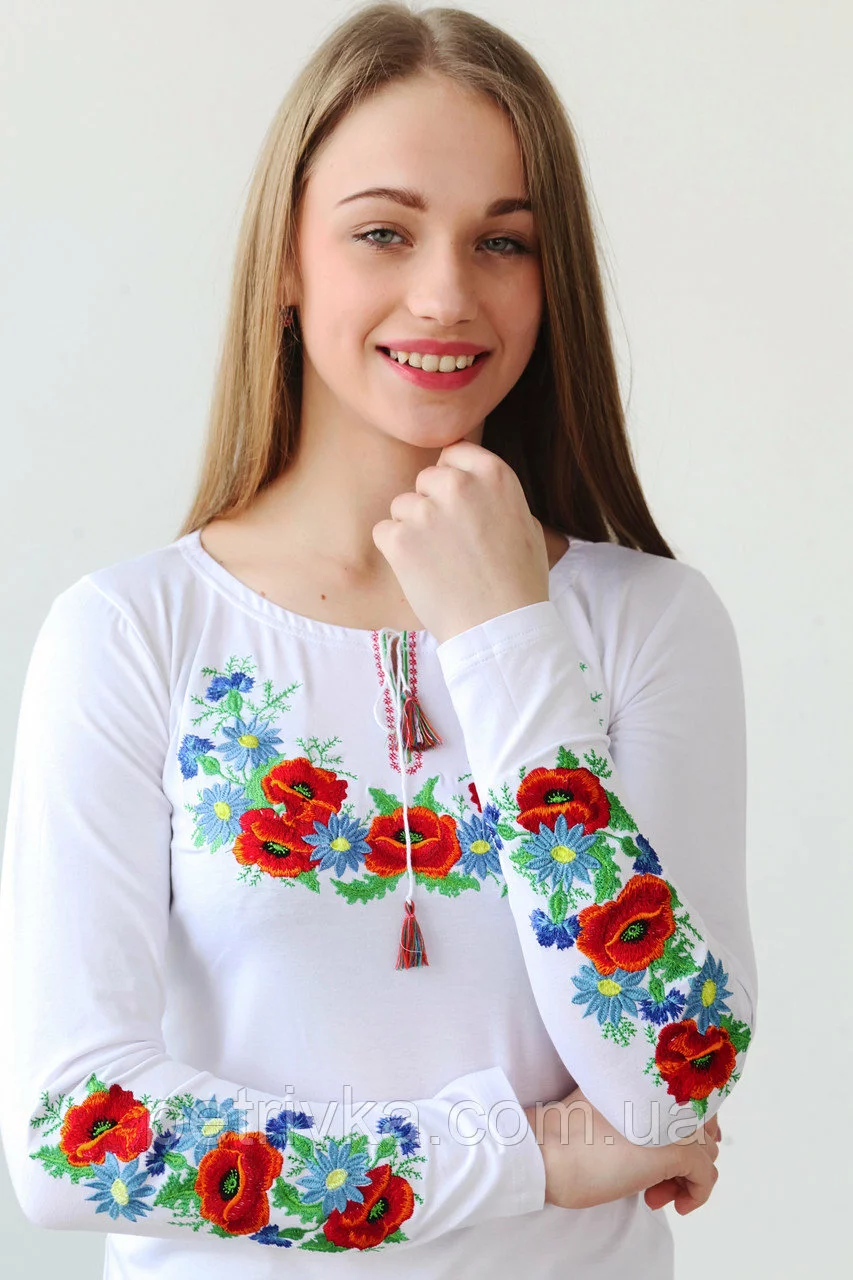 Неймовірна жіноча вишита футболка на довгий рукав, з вишивкою на рукавах маки В-7