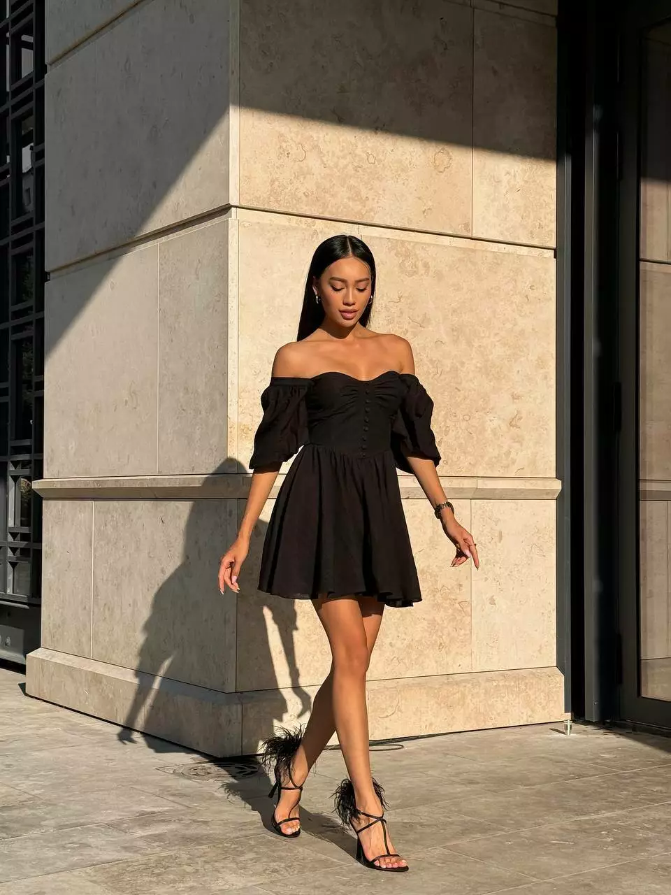 Тендітна корсетна сукня з мʼяким ліфом, обʼємними рукавами та пишною спідницею. Обʼєм сукні регулюється корсетною шнурівкою по спинці.