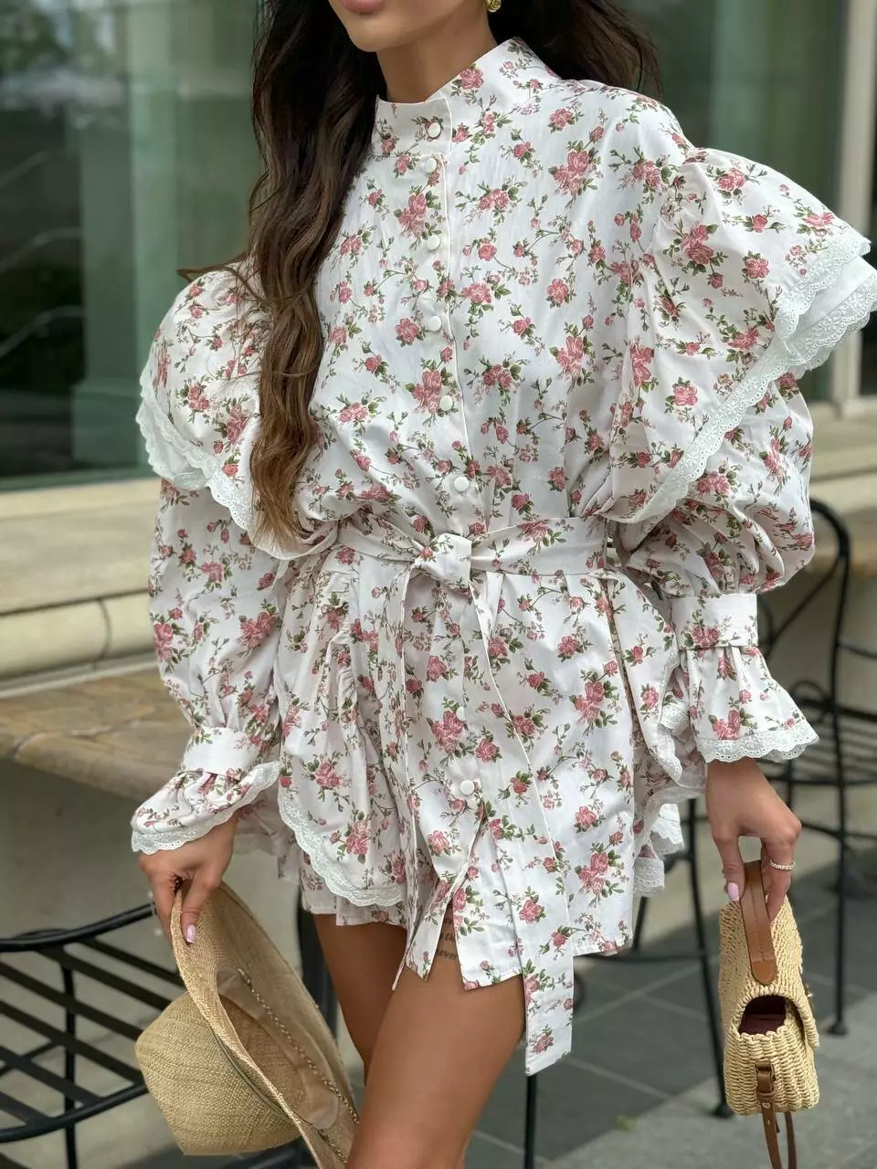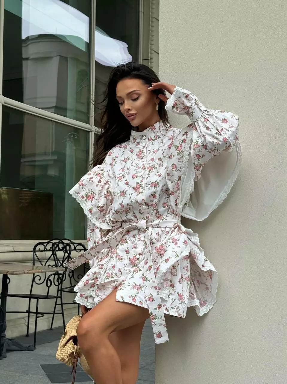 Бавовня сукня в квіти в стилі бохо, декорована прошвою. Має крій прямої сорочки з воланами.