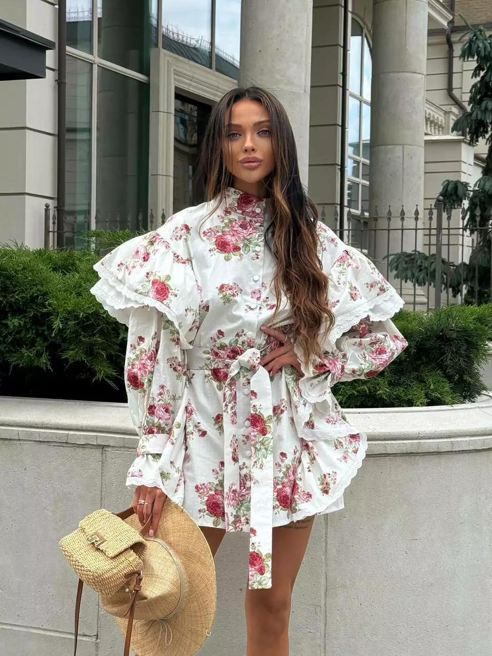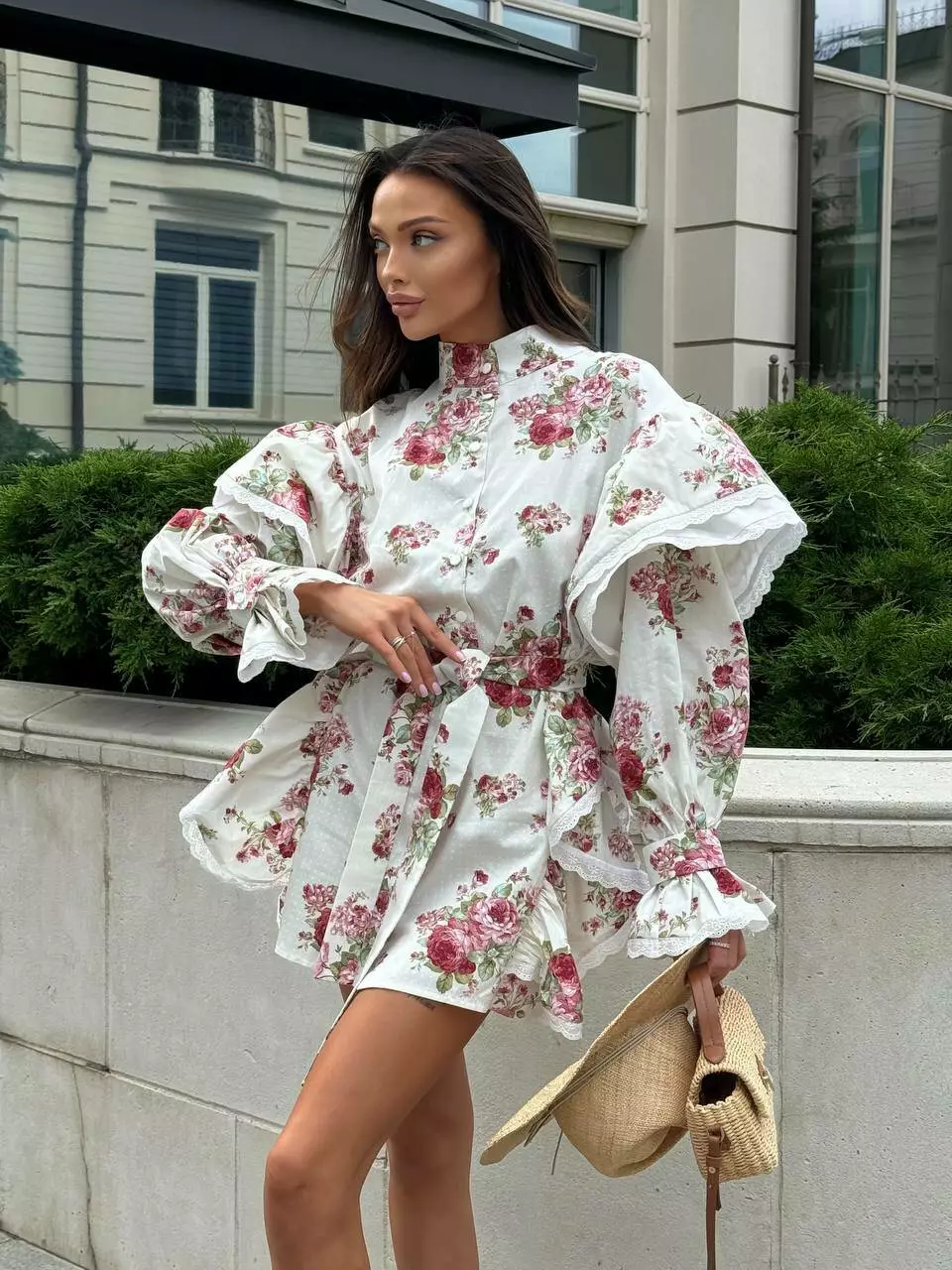 Бавовня сукня в квіти в стилі бохо, декорована прошвою. Має крій прямої сорочки з воланами.