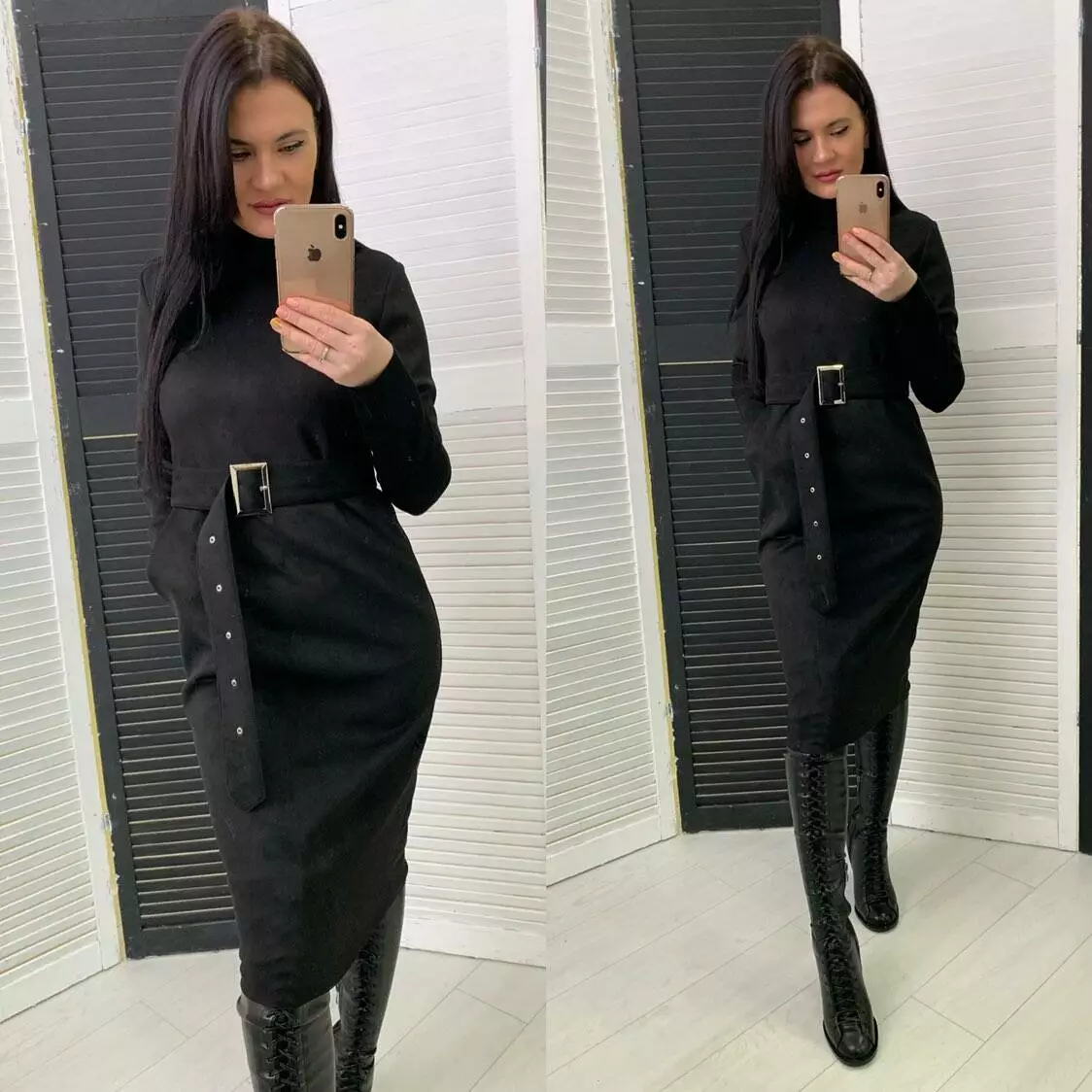Красива жіноча сукня Diamond - це не просто одяг, це вираз ділової суворості та жіночності в одному Жіноча витончена сукня під горло виготовлена із замші на дайвінгу, має високу талію, краї зрізів не оброблені, застібається на потайну блискавку по спинці Машинне делікатне прання при температурі 30°