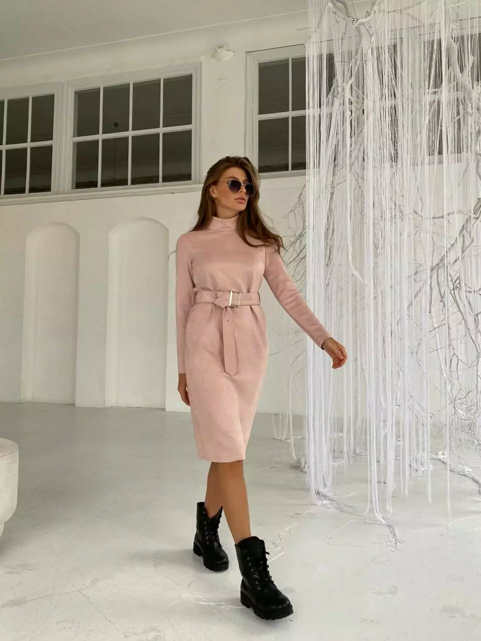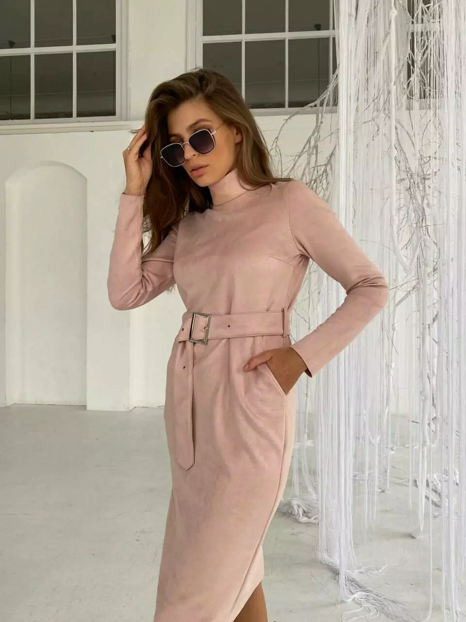 Красива жіноча сукня Diamond - це не просто одяг, це вираз ділової суворості та жіночності в одному  Жіноча витончена сукня під горло виготовлена із замші на дайвінгу, має високу талію, краї зрізів не оброблені, застібається на потайну блискавку по спинці Машинне делікатне прання при температурі 30°
