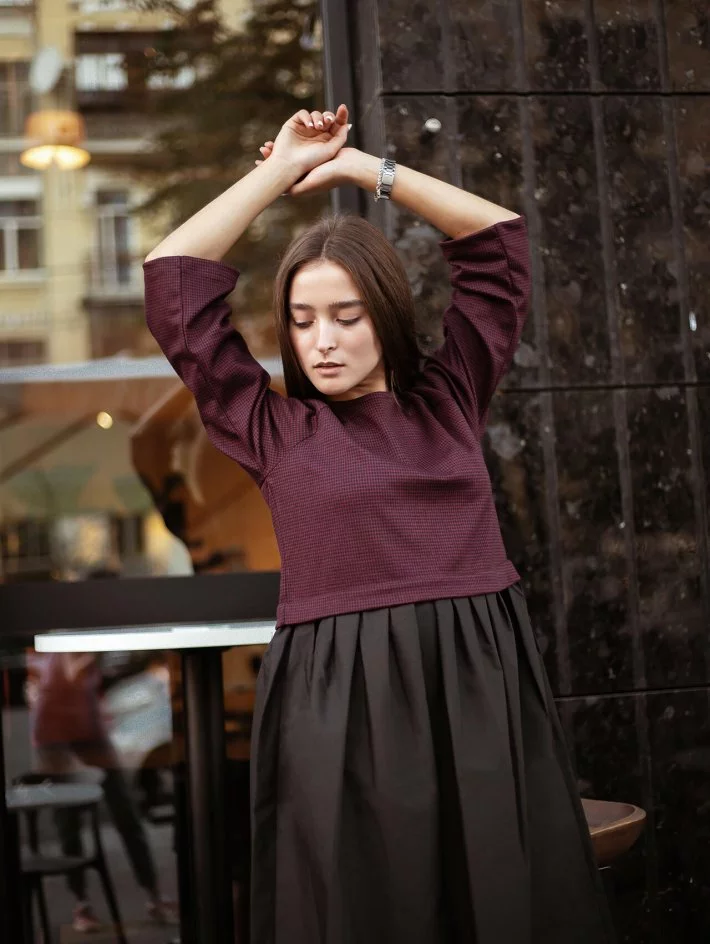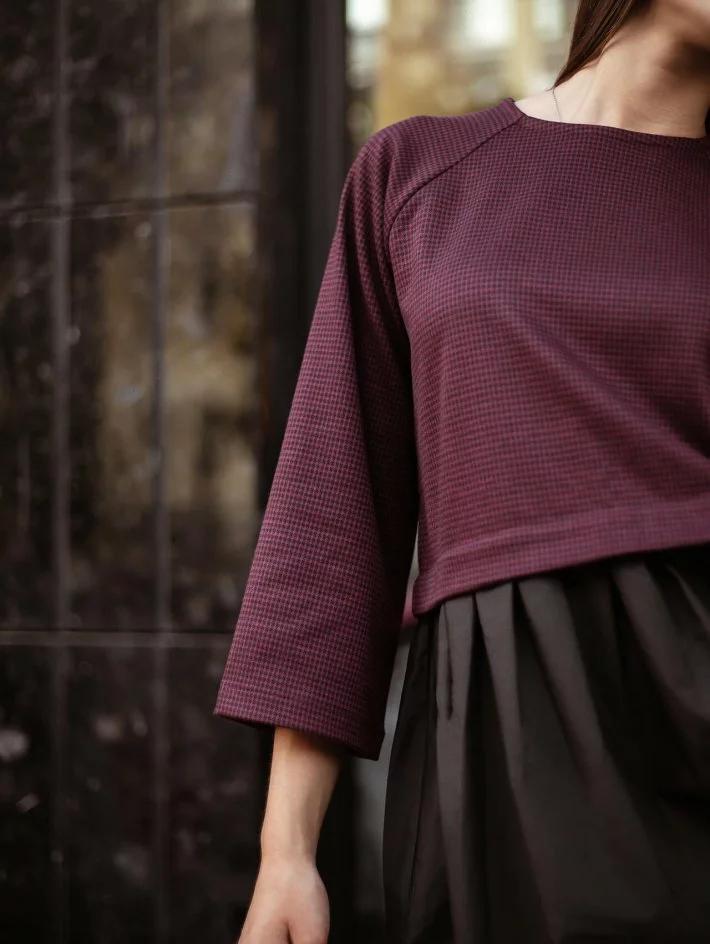 спідниці передбачені бічні місткі кишені. Рукав реглан 3/4, ззаду