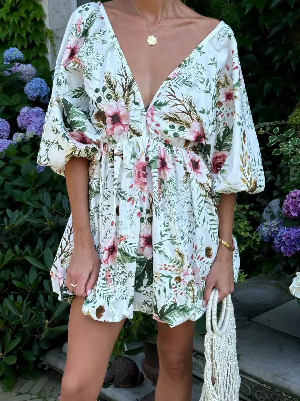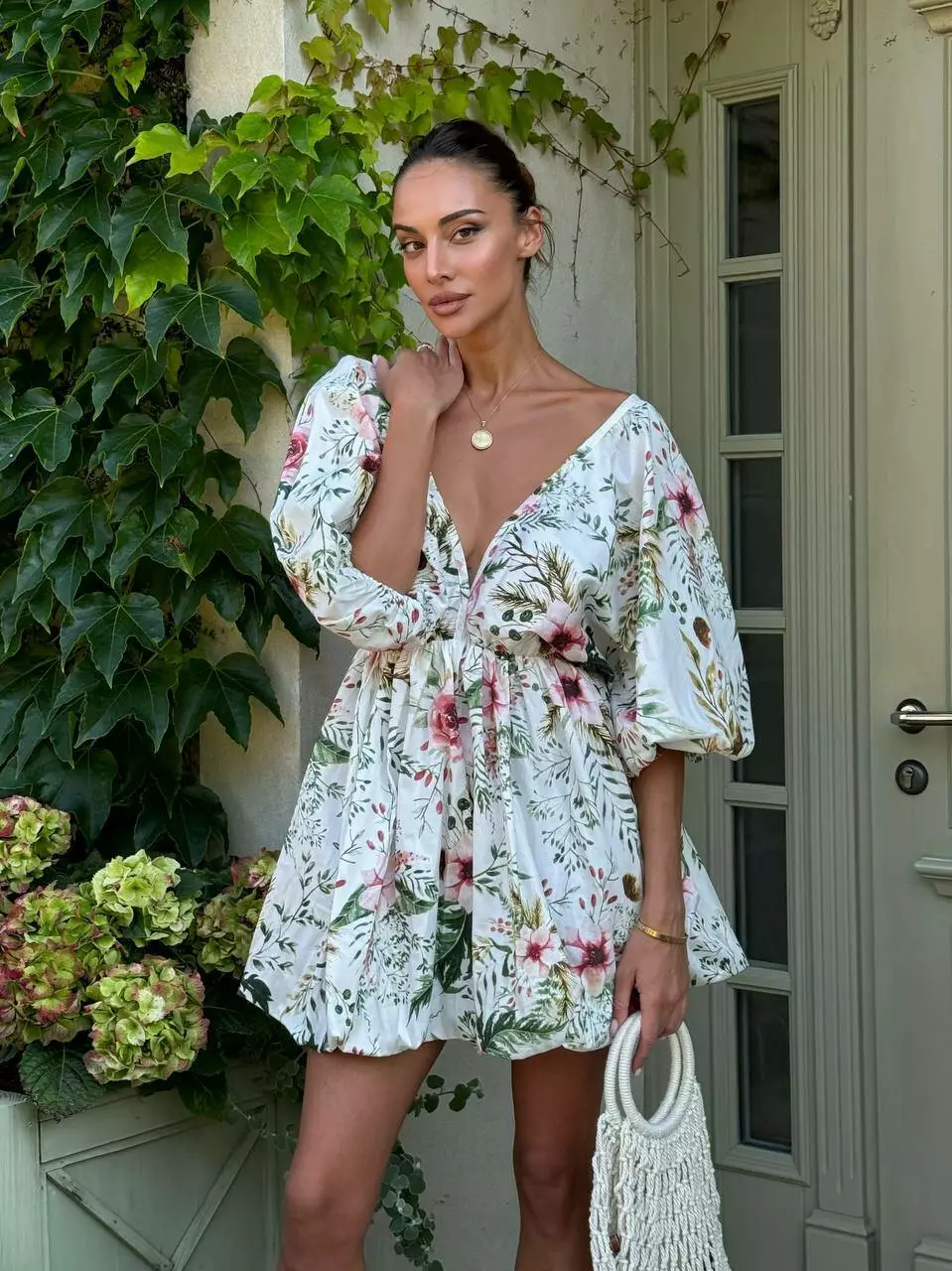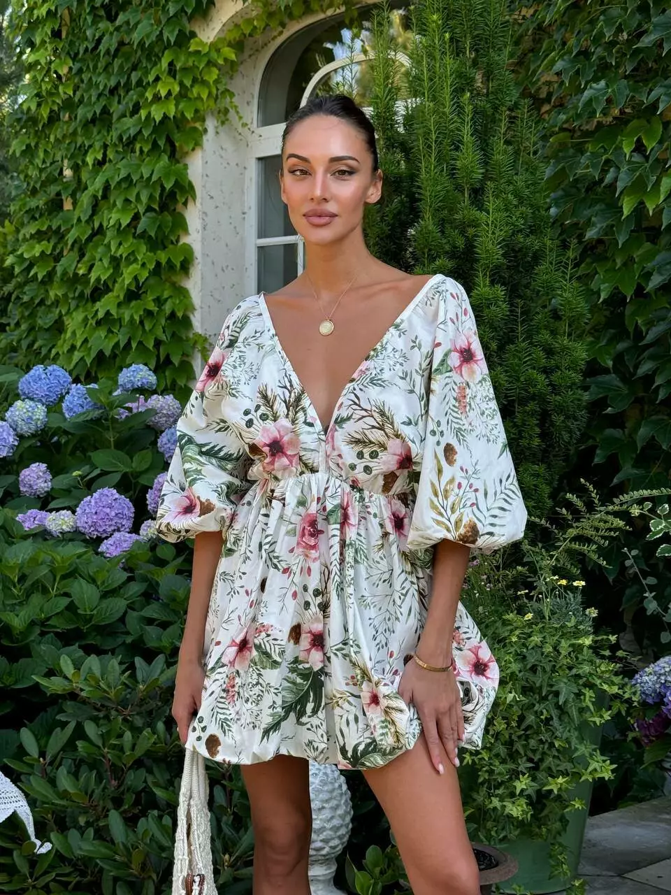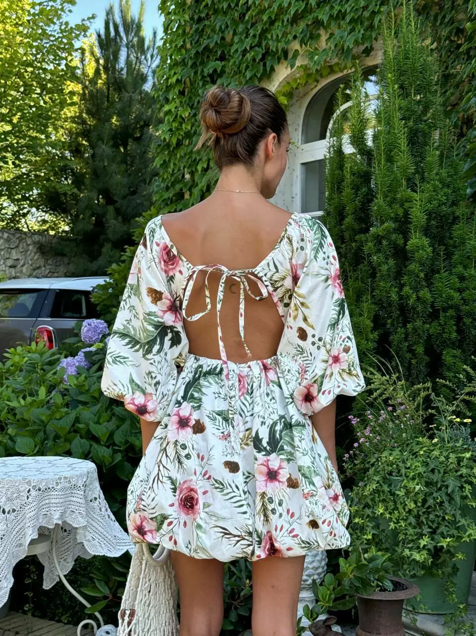 Бавовняна сукня с стилі хмарки ( балон), обʼємна широка повітряна спідниця та верх в літуча миша. Сукня регулюється завʼязкою по спинці. Спинка оголена Глибоке декольте, але досить стримане Талія на резинці По заду в спідниці змійка.