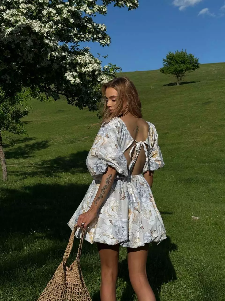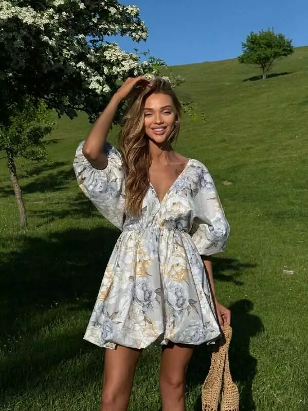 Бавовняна сукня с стилі хмарки ( балон), обʼємна широка повітряна спідниця та верх в літуча миша. Сукня регулюється завʼязкою по спинці. Спинка оголена Глибоке декольте, але досить стримане Талія на резинці По заду в спідниці змійка.