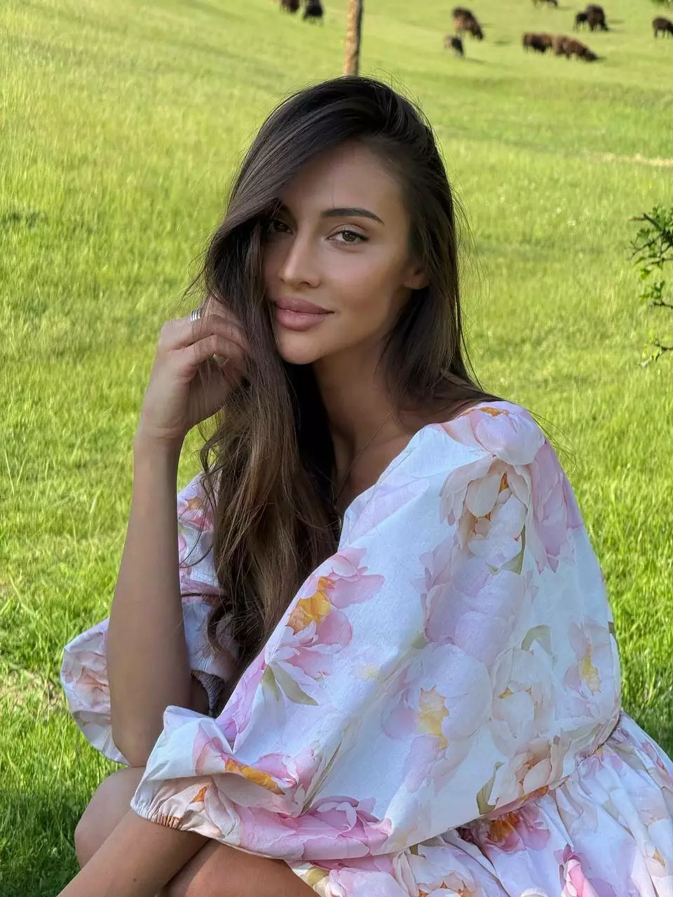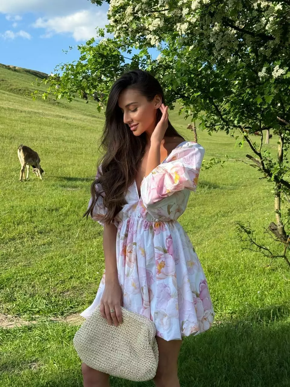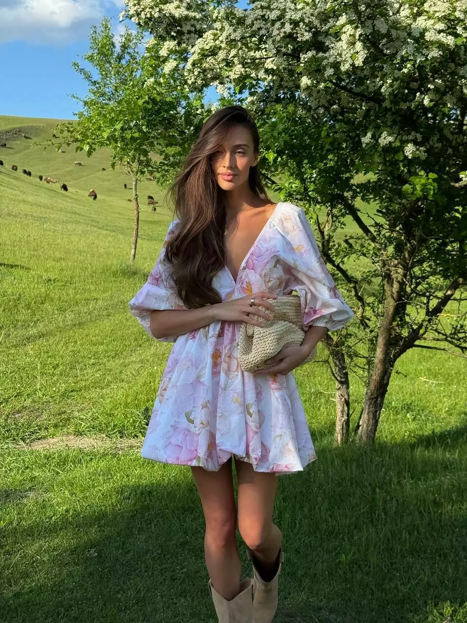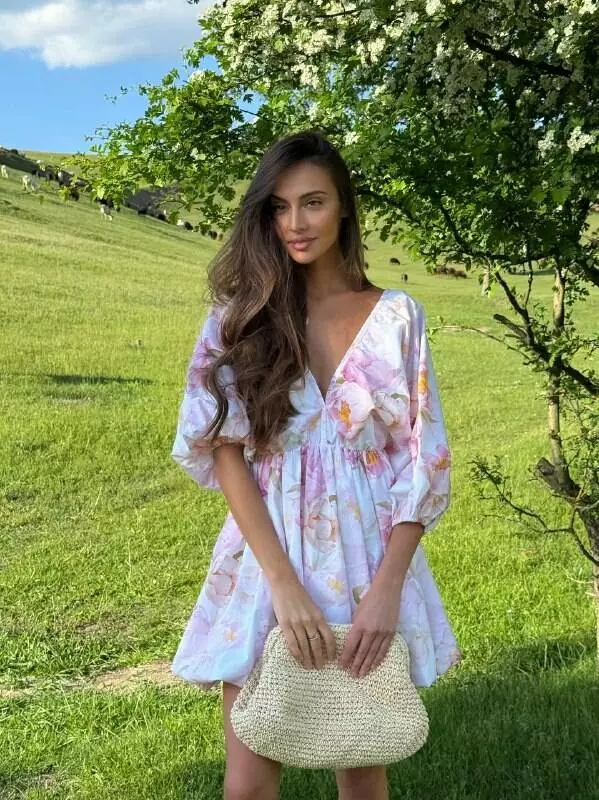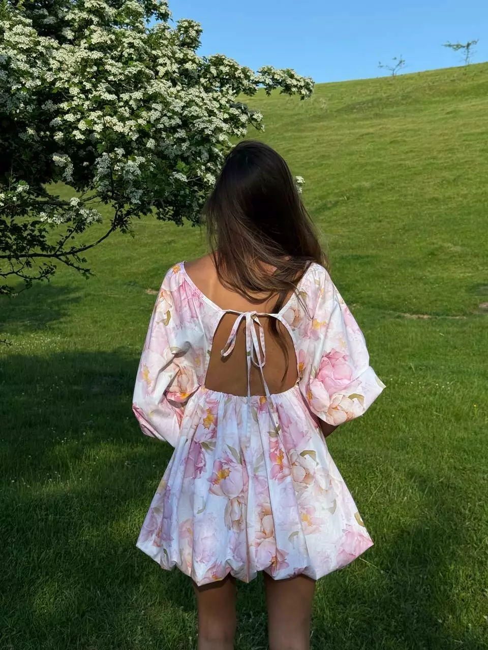 Бавовняна сукня с стилі хмарки ( балон), обʼємна широка повітряна спідниця та верх в літуча миша. Сукня регулюється завʼязкою по спинці. Спинка оголена Глибоке декольте, але досить стримане Талія на резинці По заду в спідниці змійка.