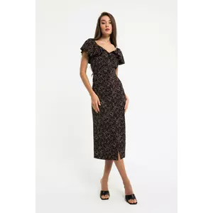 Ця сукня-міді з рельєфами й воланами на рукавах пошита з якісного матеріалу софт принт дрібноквіт на чорному, що надає їй вишуканого вигляду й унікальності. Рельєфи на сукні створюють ефектний об'єм, а волани на рукавах додають жіночності та легкості. Ця сукня ідеально підійде для особливих випадків. Однак, завдяки своєму стильному дизайну, також підійде для повсякденних образів. Ви можете носити її з підборами та стильною сумкою для створення елегантного образу, або ж з кедами та джинсовою курткою для комфортнішого аутфіту. Сукня має зручну посадку й відмінно сідає по фігурі, що робить її ще привабливішою.