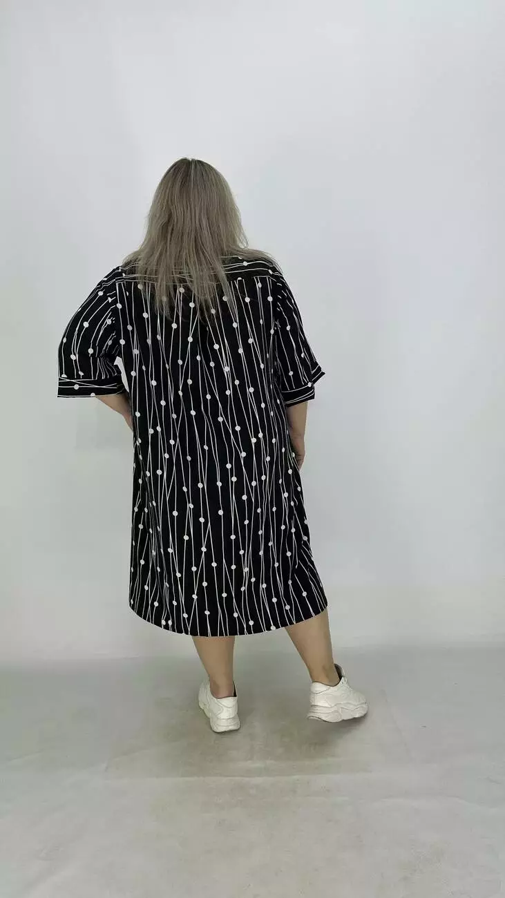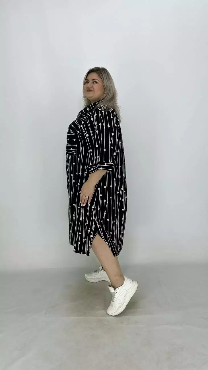 Сукня - сорочка з супер софту, дуже легка, м'яка, приємна до тіла, не меніться, розтяжності немає. Силует трапеція, по грудях вільне, опущена пройма підходить на будь-які груди, з боків підрізи. Комір сорочковий, кишені накладні, застібається на гудзики.
