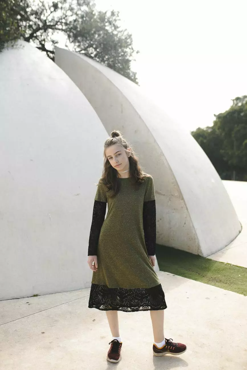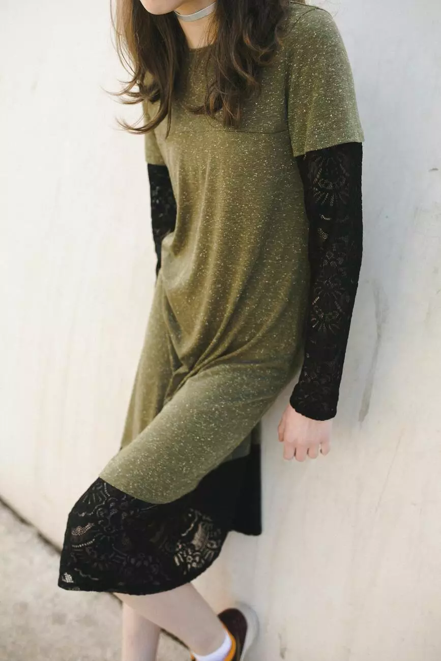 футболковий крій. Чорне мереживо на рукавах і спідниці.