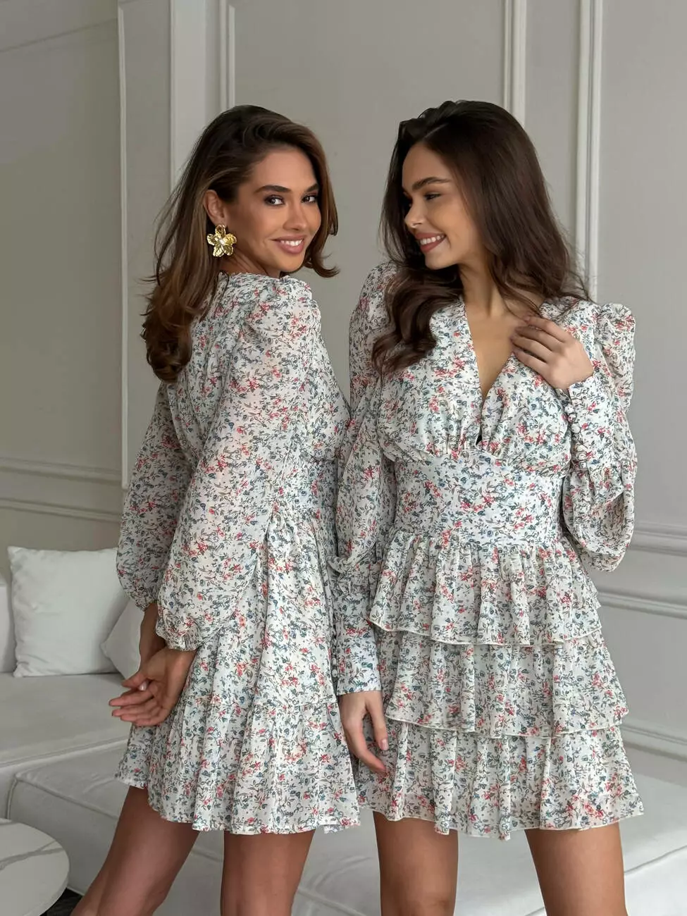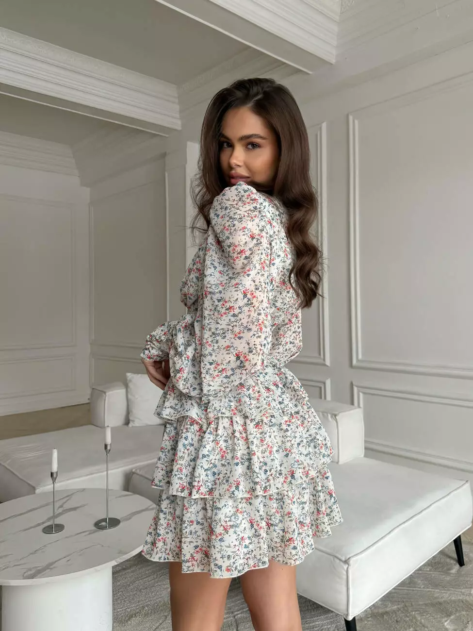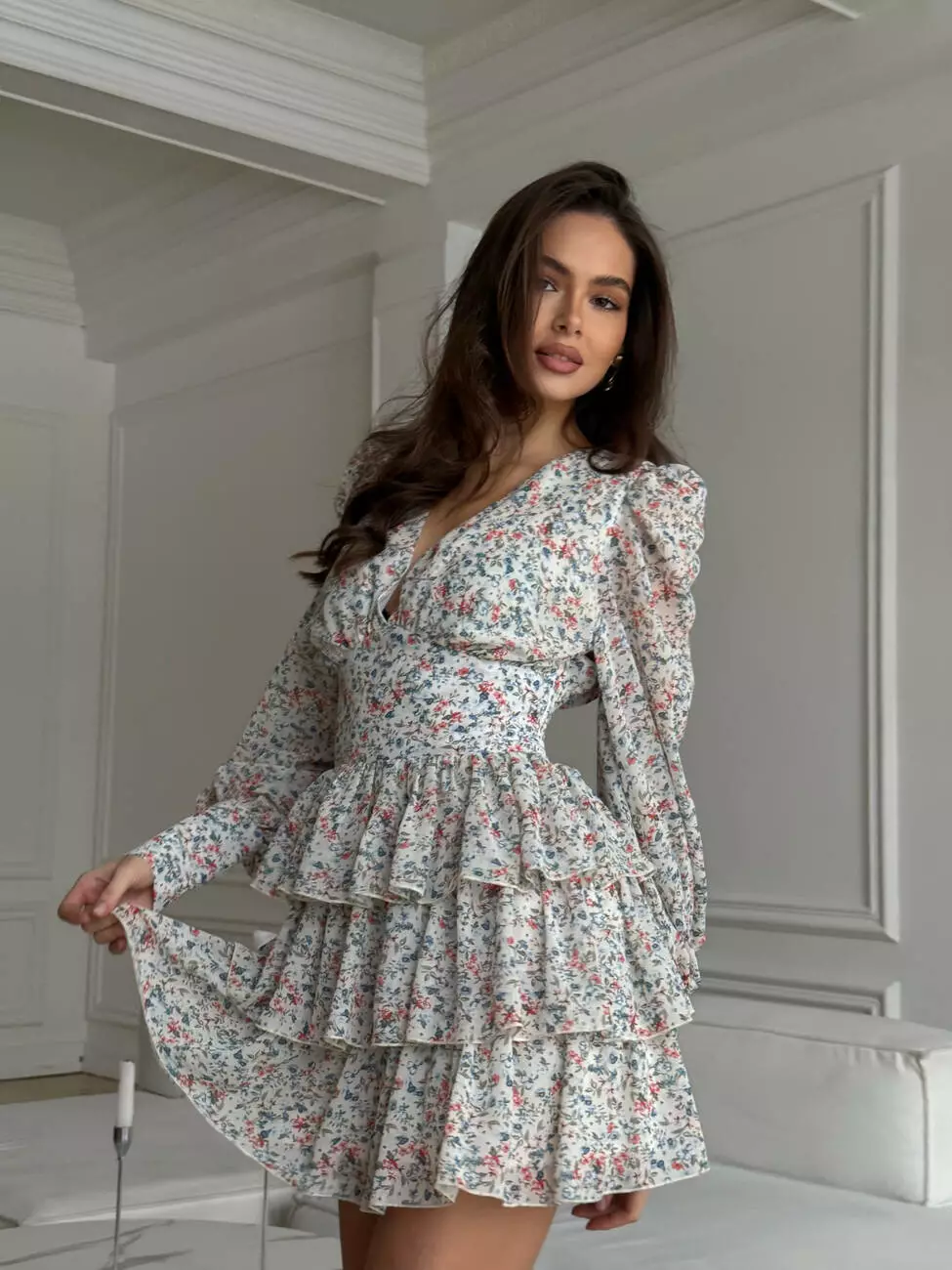 Тендітна повітряна сукня, з V -образним декольте. Талія має ефект утяжки талії, по спинці резинка. Широкі манжети рукавів декоровані ґудзиками обтягнутими в тканину. Спідниця 3 шарова та пишна.