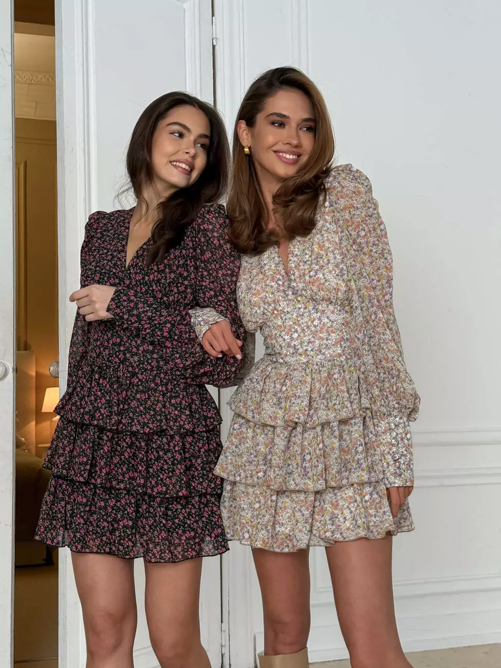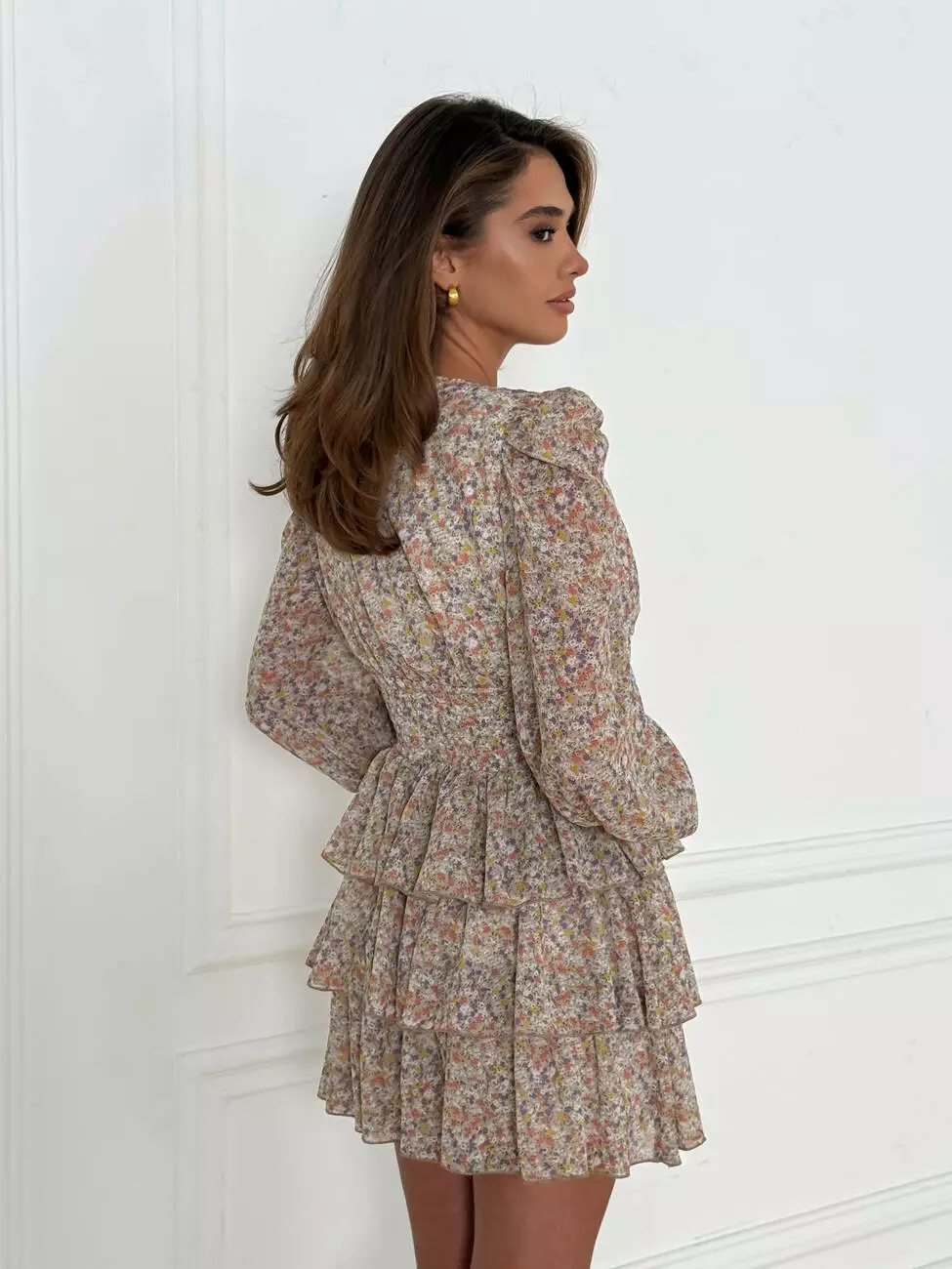 Тендітна повітряна сукня, з V -образним декольте. Талія має ефект утяжки талії, по спинці резинка. Широкі манжети рукавів декоровані ґудзиками обтягнутими в тканину. Спідниця 3 шарова та пишна.