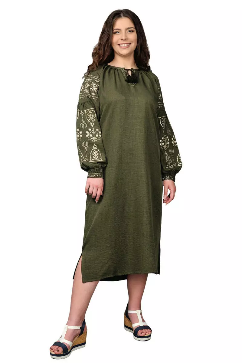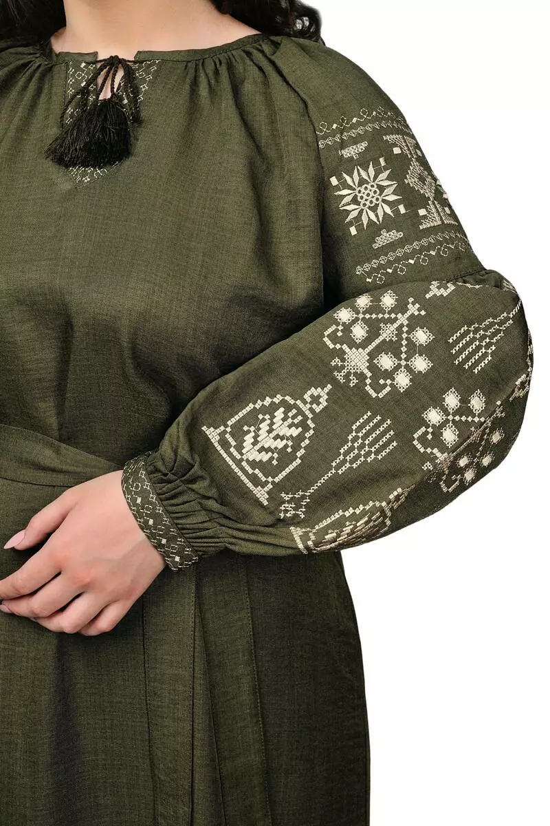 Сукня-вишиванка вироблена з якісних матеріалів. Тканина - льон-штрих приємна на дотик. Ошатні візерунки на рукавах і грудях вишиті машинним способом. Важливо, що навіть після багаторазового прання тканина і вишивка зберігають свої початкові кольори.