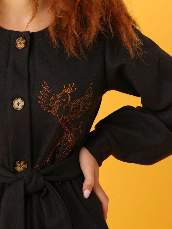 вишивкою "Жар птиця" і має пояс в комплекті. Довгий рукав на