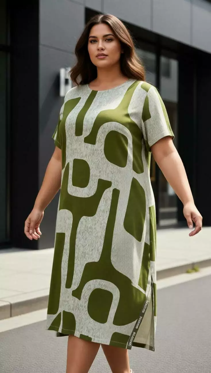 Елегантна жіноча сукня батал у трендовому оливковому кольорі з бежевим геометричним принтом. Свіже та сучасне поєднання кольорів та вільний силует роблять цю модель дуже привабливою.