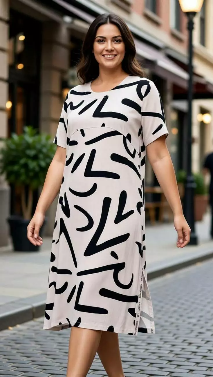 Витончена жіноча сукня батал у ніжному пудровому кольорі з контрастним чорним принтом. Поєднання м'якого відтінку та графічних ліній створює сучасний та дуже жіночний образ.