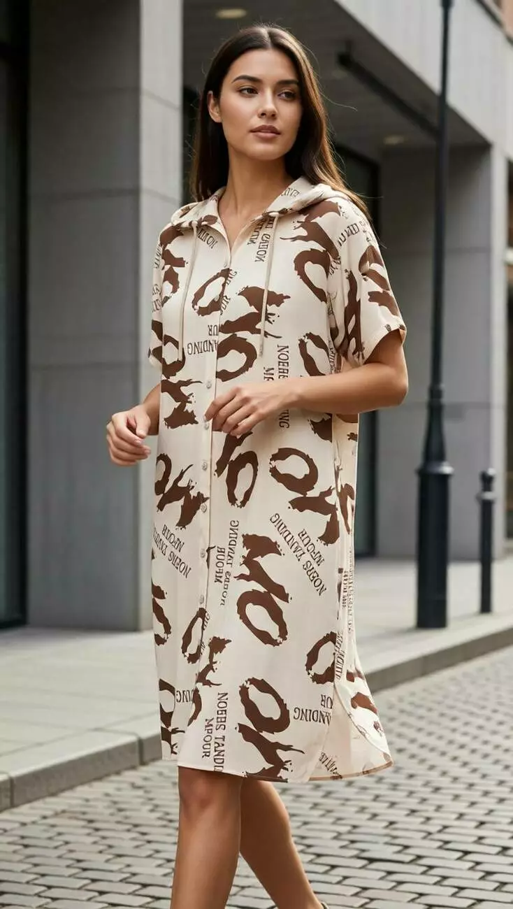 Елегантна жіноча сукня батал з капюшоном у бежевому кольорі з модним принтом. Вільний фасон забезпечує комфорт і стильний вигляд.