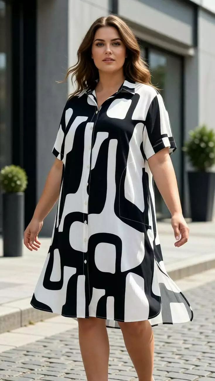 Стиль та впевненість у кожній деталі. Ця модель у контрастній чорно-білій гамі — безпрограшний варіант для базового гардероба. Великий абстрактний принт візуально коригує силует, приховуючи зайве та створюючи динамічний образ. Вертикальна планка на ґудзиках додає стрункості.