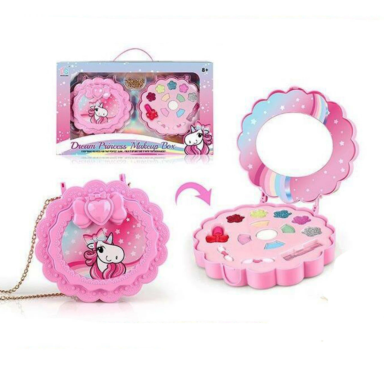 розовый цвет и включает в себя съемную крышку с ручкой и зеркалом.