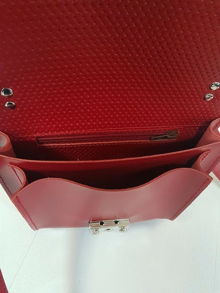 Сумочка закрывается на замок-защелку, имеет два отделения и потайной внутренний карман. Имеется короткая ручка и широкий плечевой ремень на карабинах с регулировкой длины.