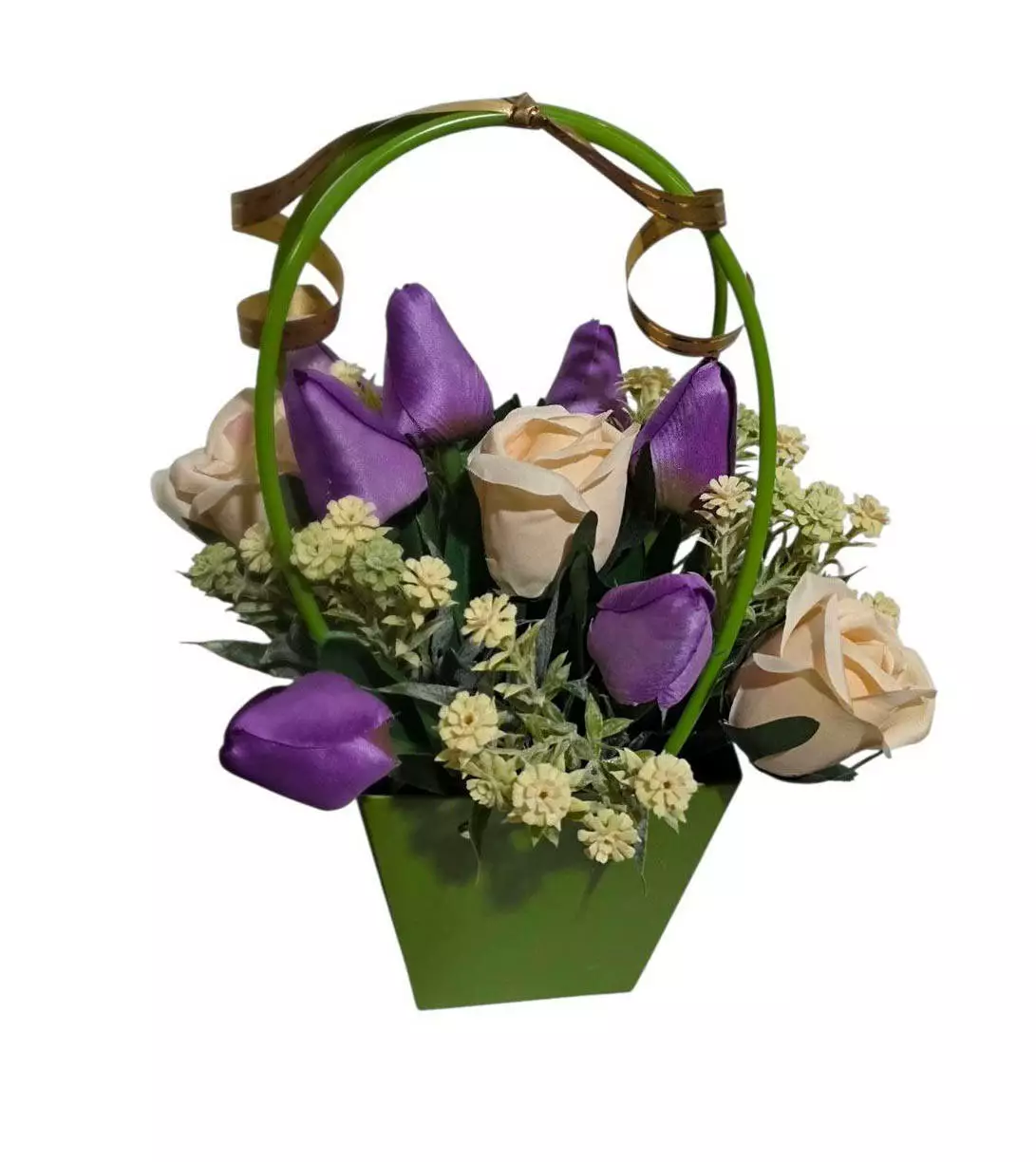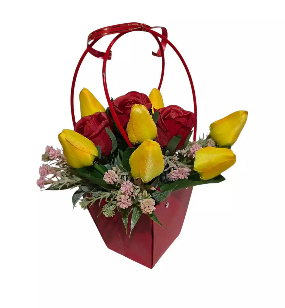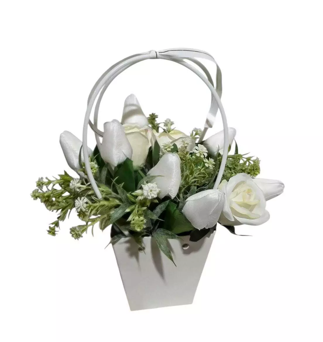Сумочка паперова з 7 тюльпанами, 3 троянди та евкаліпт, розміром 31*21см.