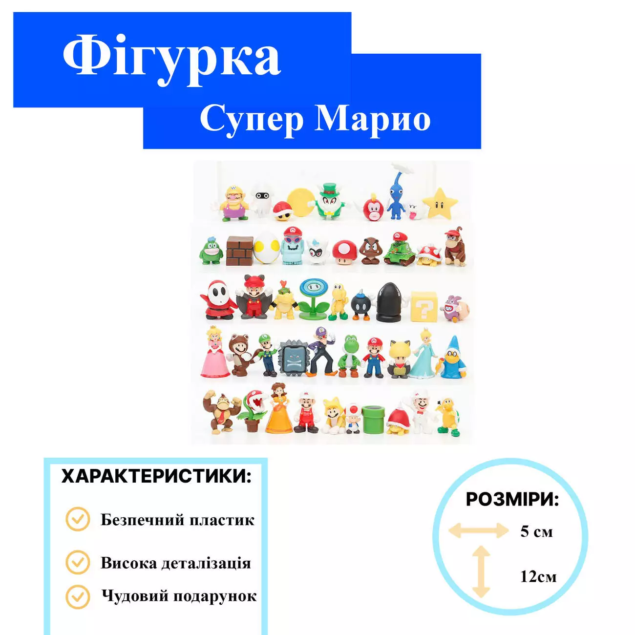 Набор фигурок Супер Марио пригодится для тех, кто любит играть в классическую видеоигру Super Mario. Набор содержит 48 фигурок в разных размерах от 2 до 5 см. Фигурки отображают главных героев и врагов из игры: Супер Марио, Лизард, Тугги, Гомба, Колдун, Буба и другие. Фигурки выполнены из пластика и обладают высоким качеством. Они очень крепкие и могут выдерживать длительное использование. Набор прекрасно подходит для детей разных возрастов и поможет приятно провести время. Благодаря разным размерам и формам фигурки подходят для создания многих интересных игровых сцен. Комплект обеспечивает детям массу удовольствия и увлечения.