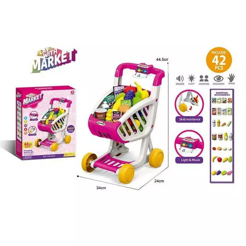 Візок з продуктами 922-157 (18) 42 елементи, пісні англ. мовою, підсвічування, візок для покупок, муляжі продуктів, наліпки, в коробці