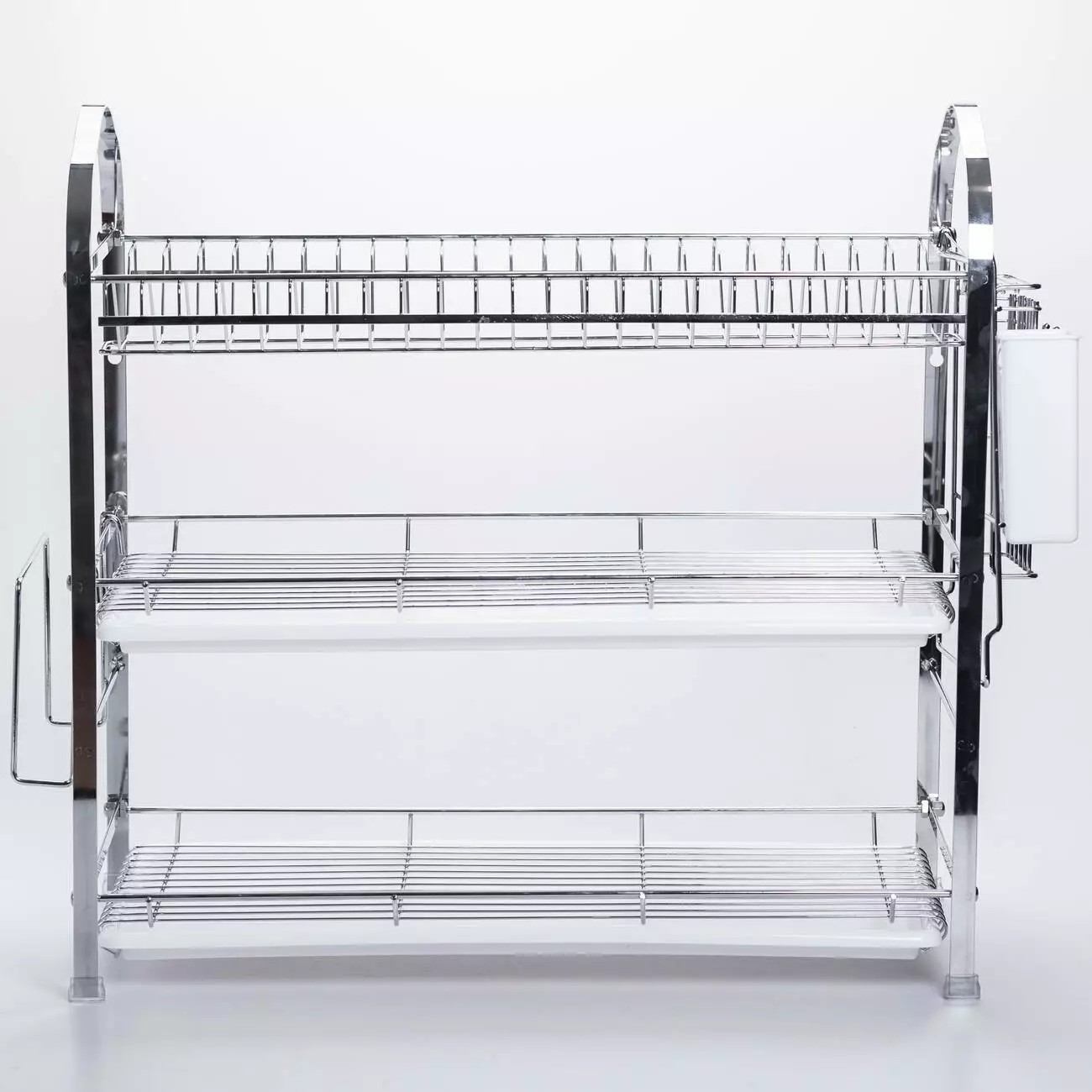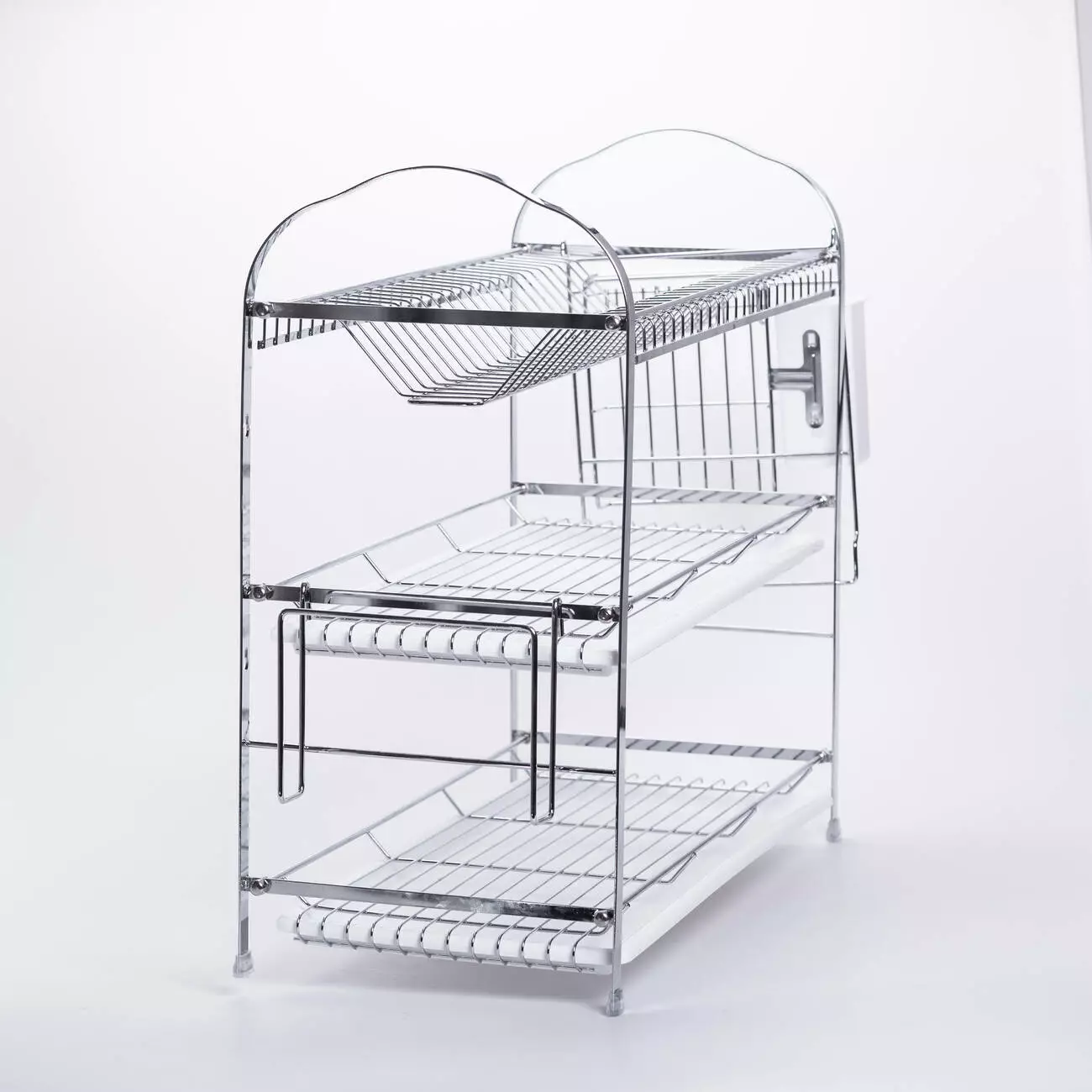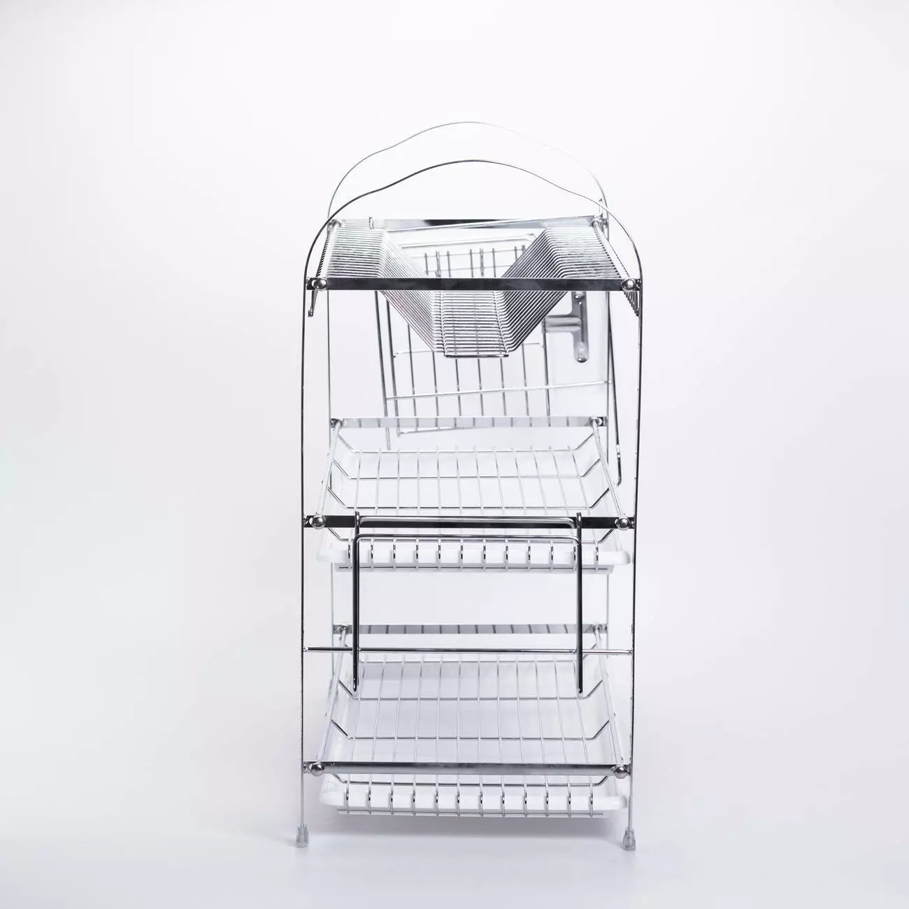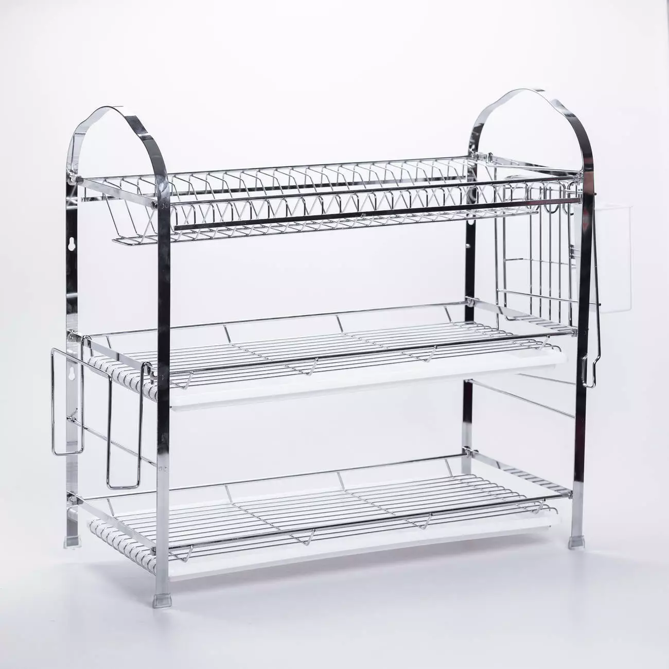 Ця компактна та практична сушарка виконана з хромованої сталі, що забезпечує їй міцність, довговічність та стійкість до корозії. Модель складається з трьох рівнів для розміщення посуду та столових приладів – верхній ярус для тарілок та кришок з прутковою решіткою, середній та нижній яруси для кухлів, мисок та сковорідок. Ця сушарка підійде тим, хто шукає надійне та акуратне рішення для сушіння посуду: вона поєднує в собі практичність, легкість у догляді та акуратний зовнішній вигляд.