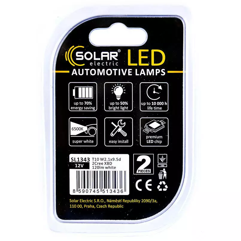 Светодиодные LED автолампы SOLAR Premium Line 12V T10 W2.1x9.5d 2Cree XBD 120lm white блистер 2шт (SL1343)