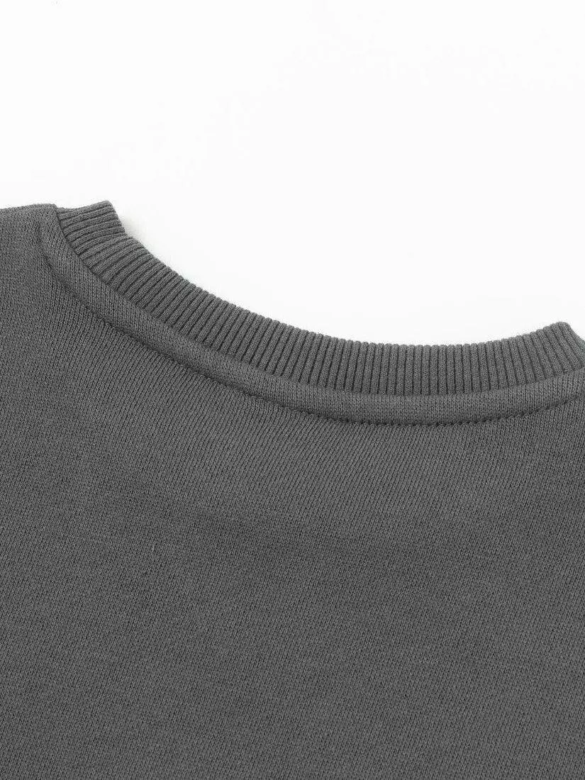 сірого кольору. Кругла горловина. Довгий рукав. На грудях принт у