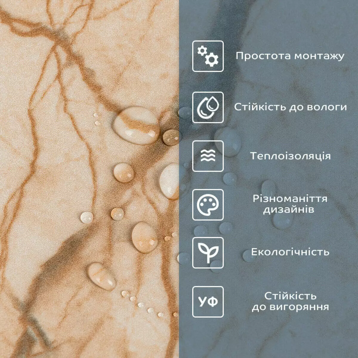 2. Стійкість до вологи: вінілова плитка стійка до вологи, що робить її відмінним вибором для ванних кімнат, кухонь та інших приміщень з підвищеною вологістю, матеріал стійкий також до впливу пари, а також до появи плісняви. Плитка підходить для створення фартуха кухні, можна клеїти біля плити на відстані не менше ніж 30-50 см;