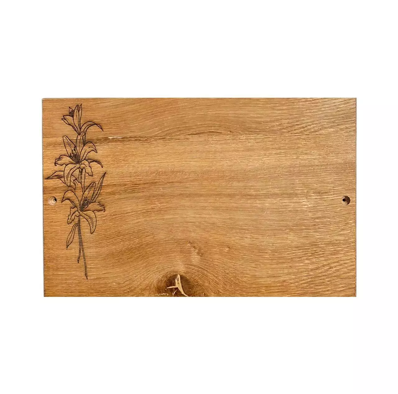 Табличка дерев'яна з дубу, розміром 20*30 см. Має 2 отвори для кріплення, зліва візерунок у вигляді квітів.