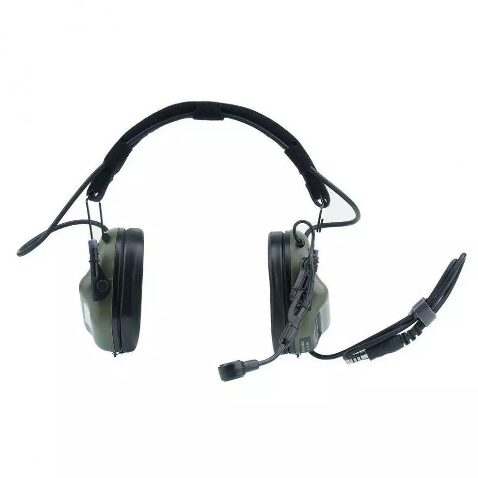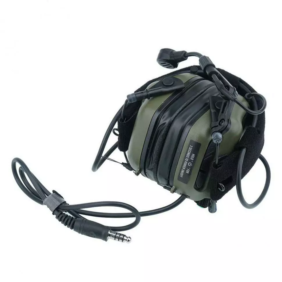 Тактические наушники с активным шумопоглощением имеют микрофон и могут подключаться к разным радиостанциям. Для полноценной работы необходимо иметь отдельно PTT (нажмите чтобы говорить) адаптер от Opsmen или использовать сторонний стандарт NATO Nexus TP120. Существуют кнопки Opsmen PTT для следующих разъемов: