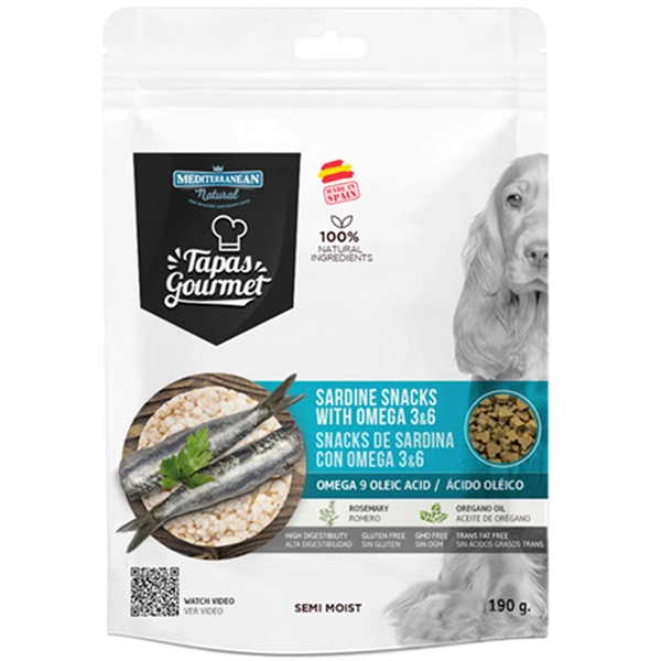 TAPAS GOURMET снеки для собак 100g, САРДИНЫ SERRANO от MEDITERRANEAN NATURAL - это 100% натуральные лакомства для собак, изготовленные из мяса и рыбы высокого качества. Содержат масло орегано и розмарин, природные антиоксиданты, которые улучшают пищеварение. Гипоаллергенны, не содержат глютена, искусственных красителей, ГМО, трансжирных кислот. Состав 31% сардины, 25% хамона, 15% говядины, рис, растительный глицерин, пивные дрожжи, консерванты: лимонная кислота, муравьиная кислота. Пищевые добавки: 0,08% масла орегано, 0,07% розмарина. Аналитические составляющие: Белок: 27,7%, сырой жир: 7,1%, сырая зола: 12,4%, клетчатка: 1,02%, влага: 11,3%, Кальций: 2,7 г / 100г, фосфор: 1,3 г / 100г, магний: 0,17 г / 100г, Омега3: 0,39 / 100г, Омега6: 0,74г / 100г; Омега9: 1,1 г / 100 г