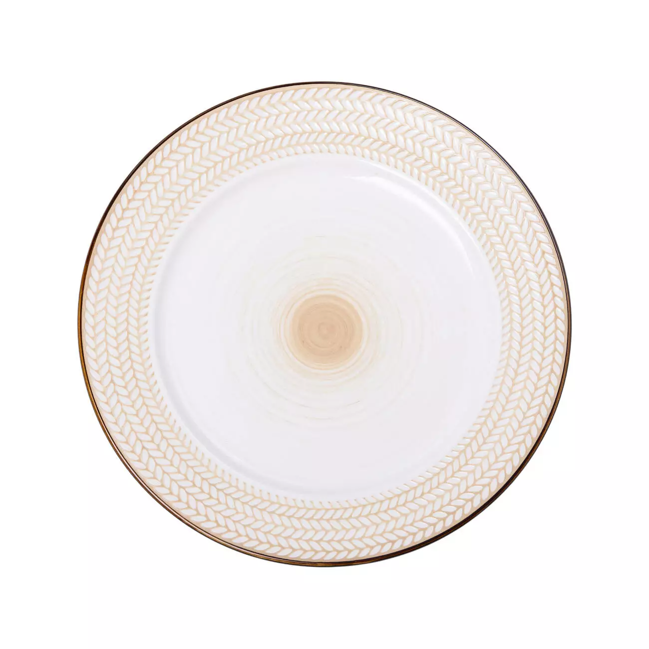 Тарілка має класичну круглу форму з трохи вигнутими краями. Її поверхня гладка та блискуча, з ледь помітними нерівностями, що характерні для порцелянових виробів ручної роботи. По краю тарілки йде золотий обідок, який підкреслює її витонченість та елегантність.